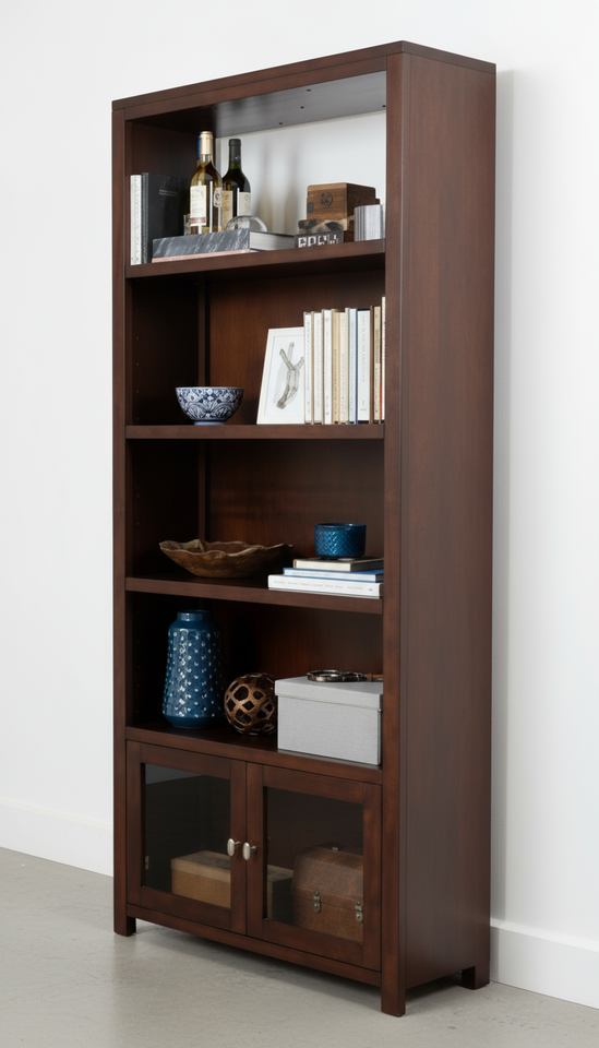 Bibliothèque moderne en bois massif de couleur café Kona à succès avec porte en verre pour salon, maison, école ou hôtel