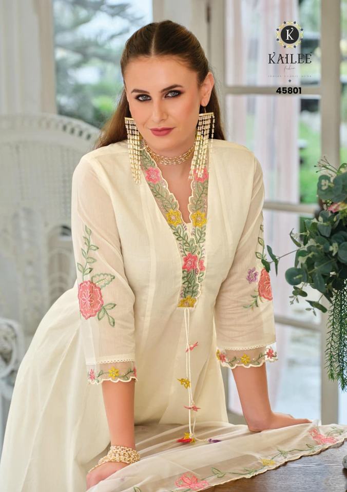 Hot Selling Mul Chanderi With Hand Work Kurti Pant And Dupatta