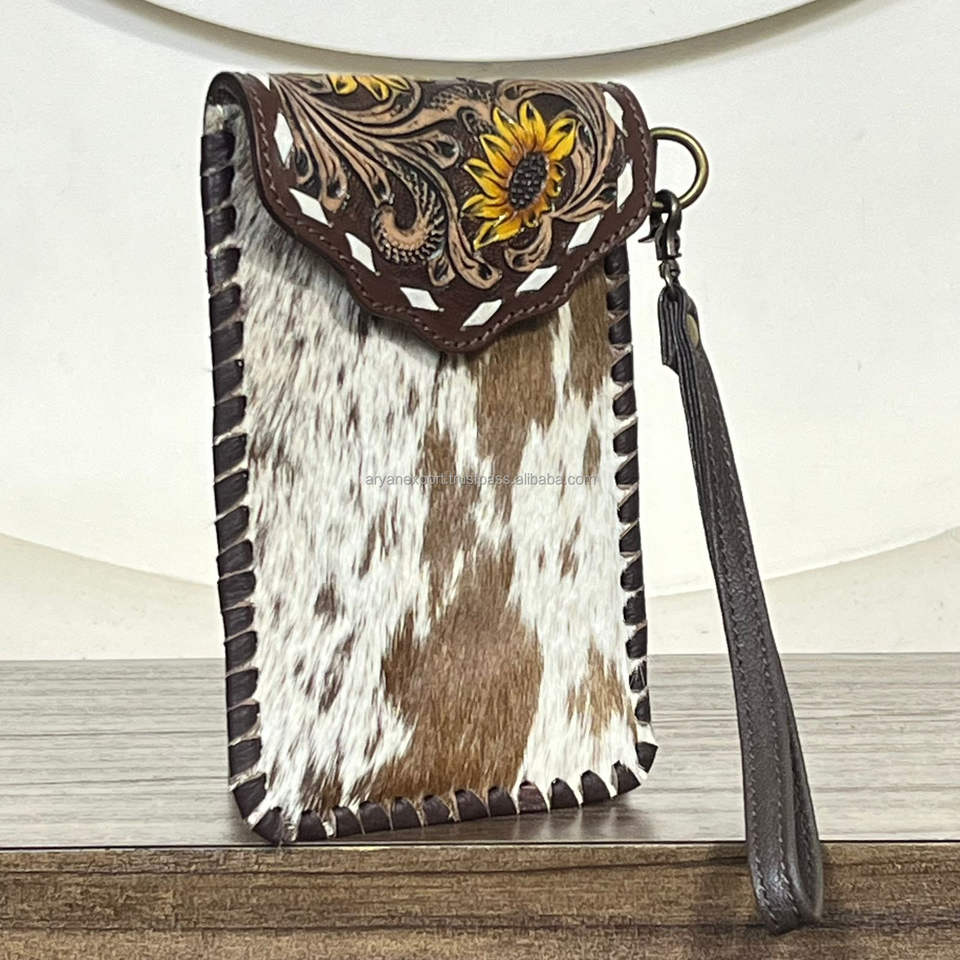 Sac à main en cuir de vachette artisanal style western, nouveauté très demandée, avec dragonne tournesol, pochette de téléphone rustique bohème à porter en bandoulière