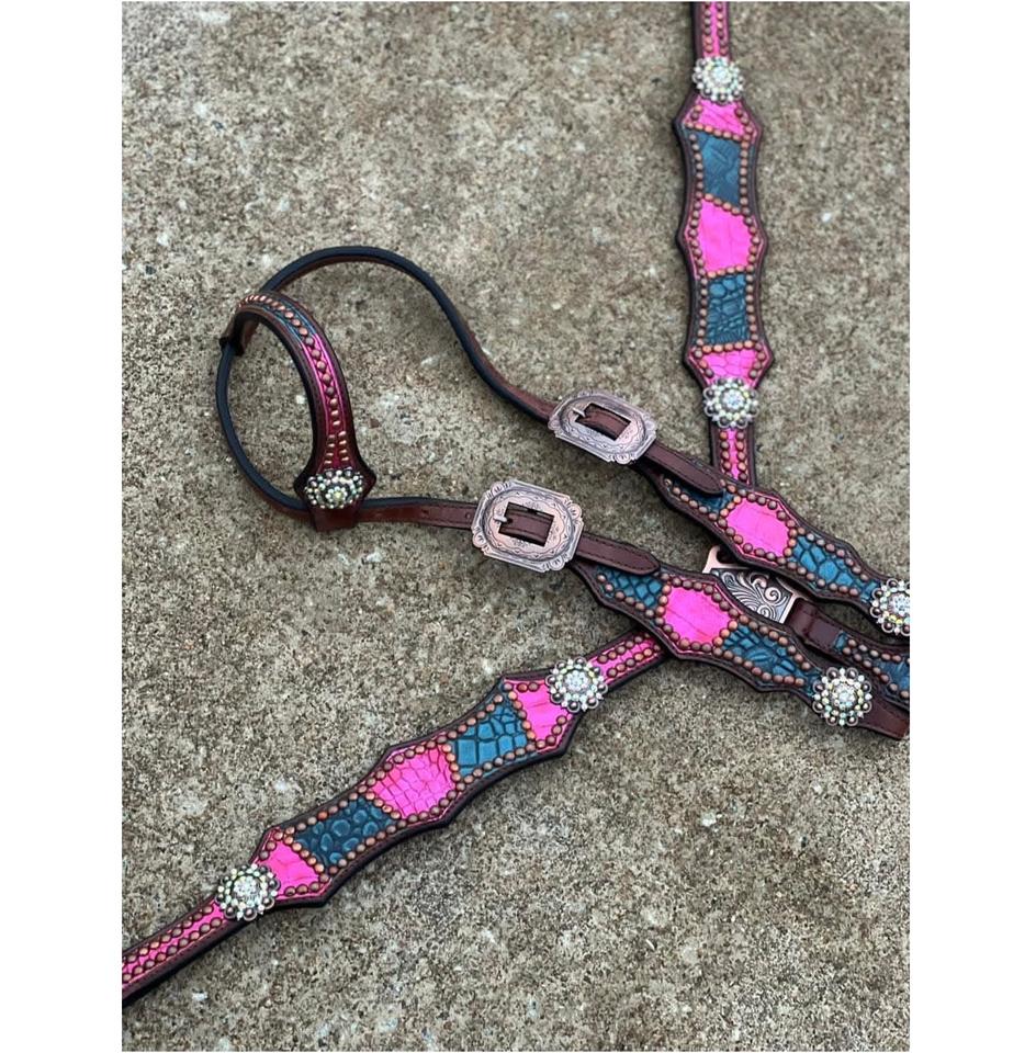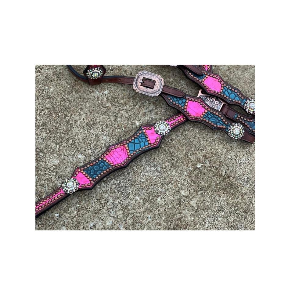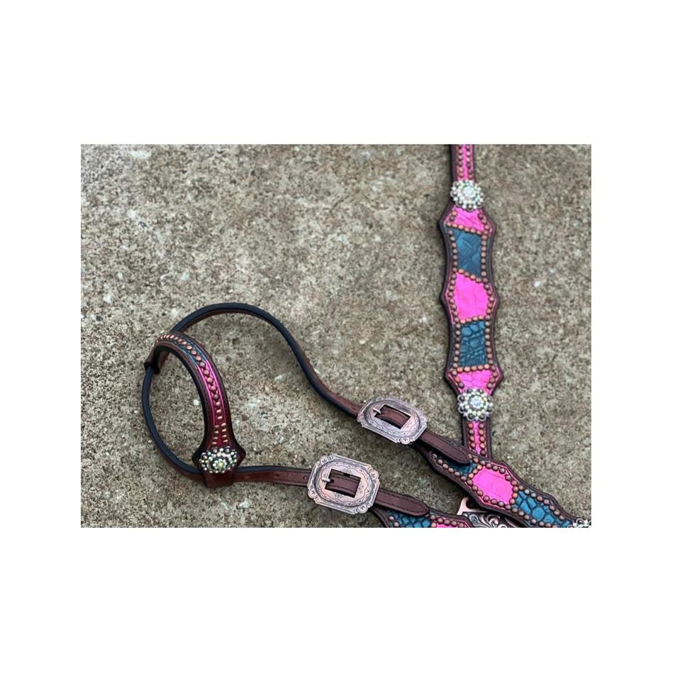Vente chaude Argent Concho Design Collier De Poitrine Ensemble Une Oreille En Cuir De Crocodile Cheval Tack Inde Une Oreille Headstall Rose Bleu Équitation