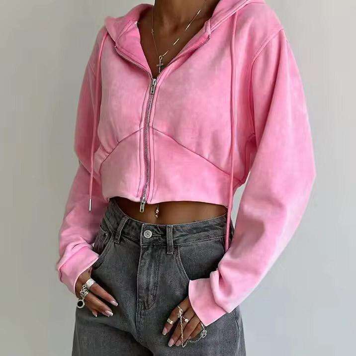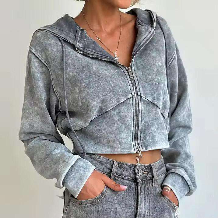 Hoodie court vintage oversize délavé à l'acide pour femme, avec fermeture éclair et col à capuche, idéal pour l'hiver – Vente en gros de sweats à capuche pour femmes