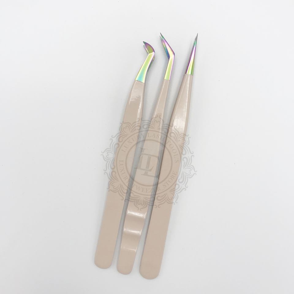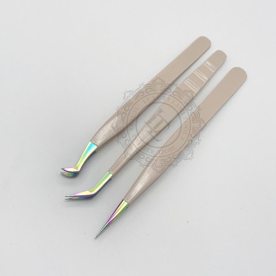 Vente chaude Peach Powder Coated Rainbow Point Lash Tweezer Set Pince à cils durable de haute qualité avec logo privé