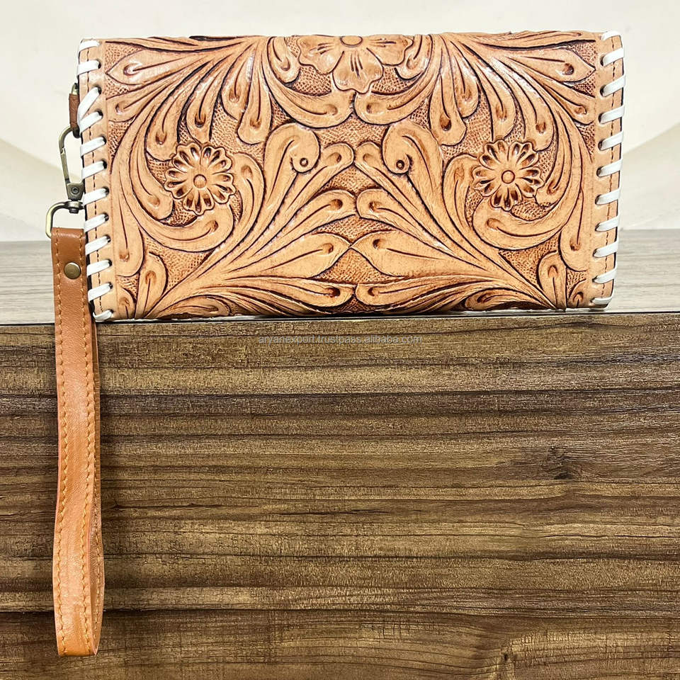 Portefeuille en cuir de vachette fait main, nouvelle collection, motif floral, avec dragonne, protection RFID, idéal pour un usage quotidien – Vente Flash