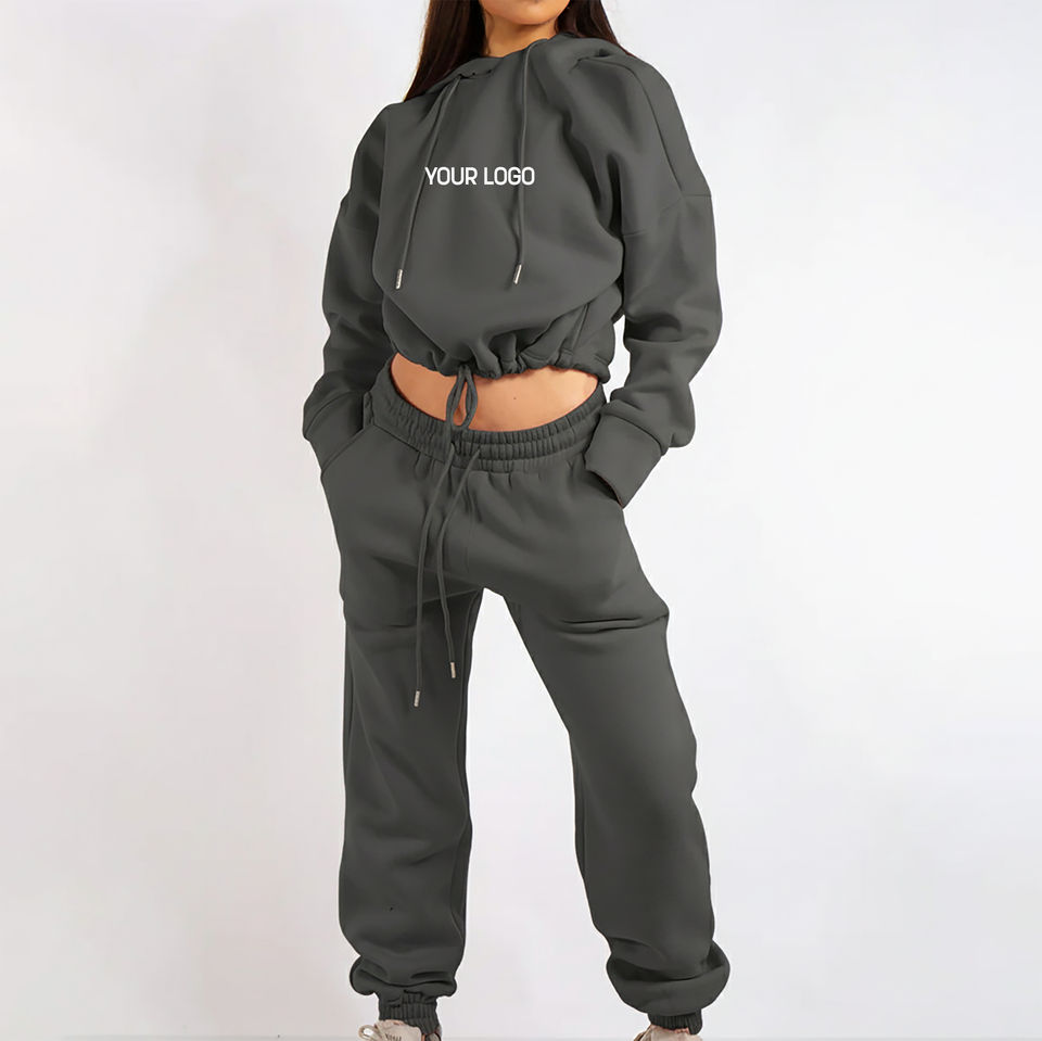 Ensemble de survêtement hiver haut de gamme couleur unie avec sweat à capuche et pantalon de jogging à revers, logo personnalisé sérigraphié, dentelle, vente chaude
