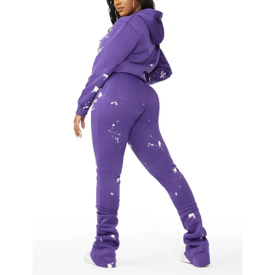 Vente chaude bouffée impression pantalons de survêtement évasé stracked élégant survêtement pour les femmes USA taille pull fermeture éclair complète survêtement à capuche