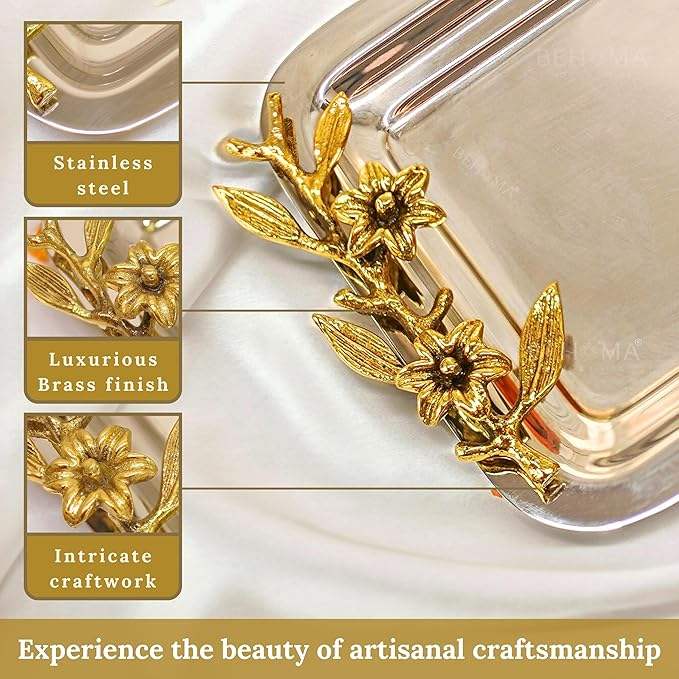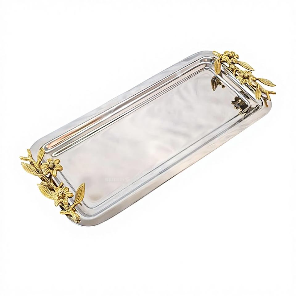 Plateau de service rectangulaire très vendu avec poignée en feuille de laiton dorée, élégant plateau en acier inoxydable