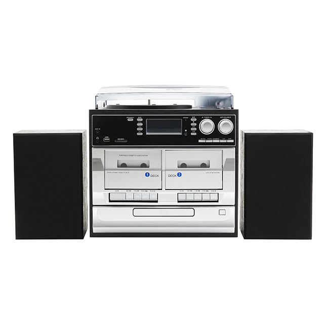 Système audio tourne-disque rétro moderne à succès avec haut-parleurs stéréo, convertisseur vinyle en MP3, lecteur CD/cassette/radio
