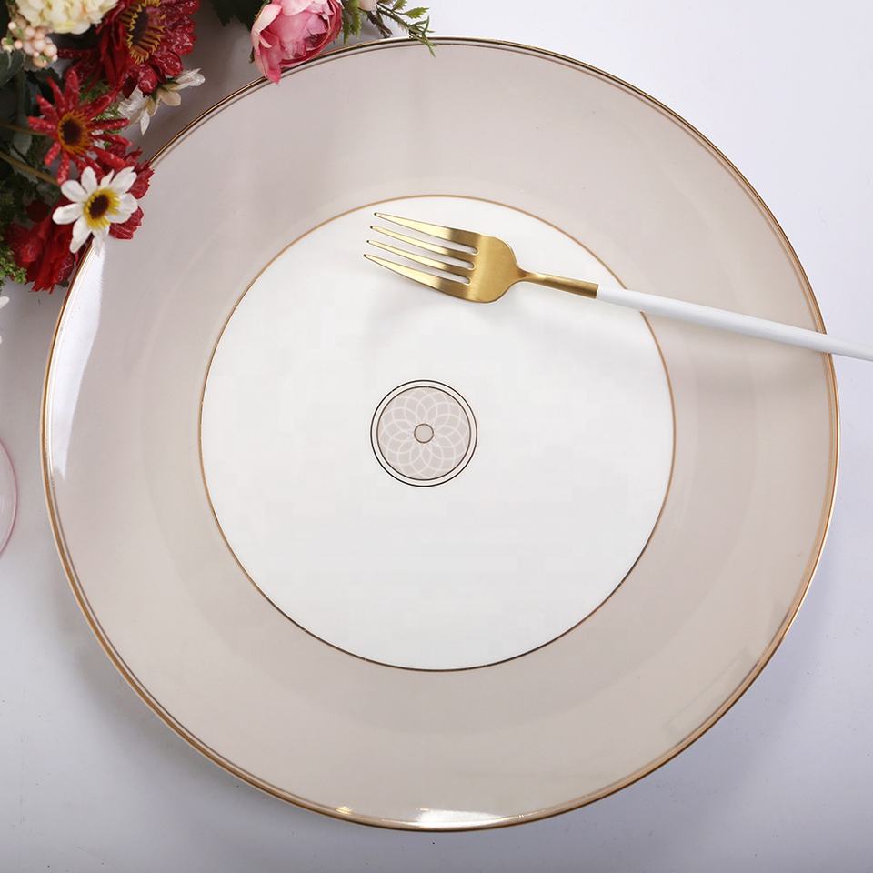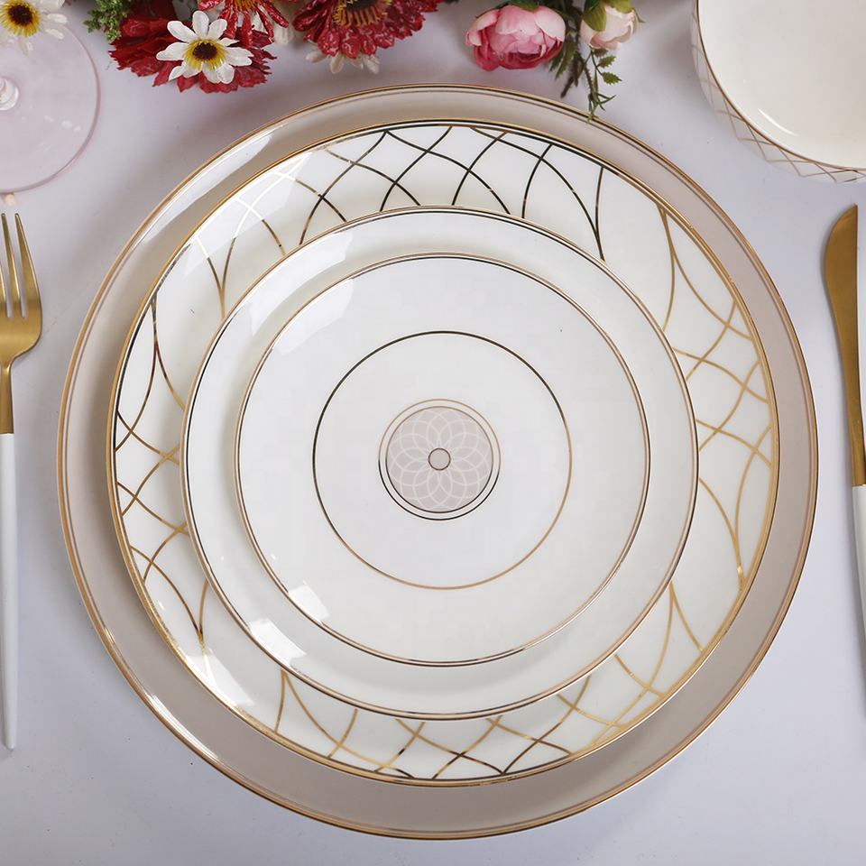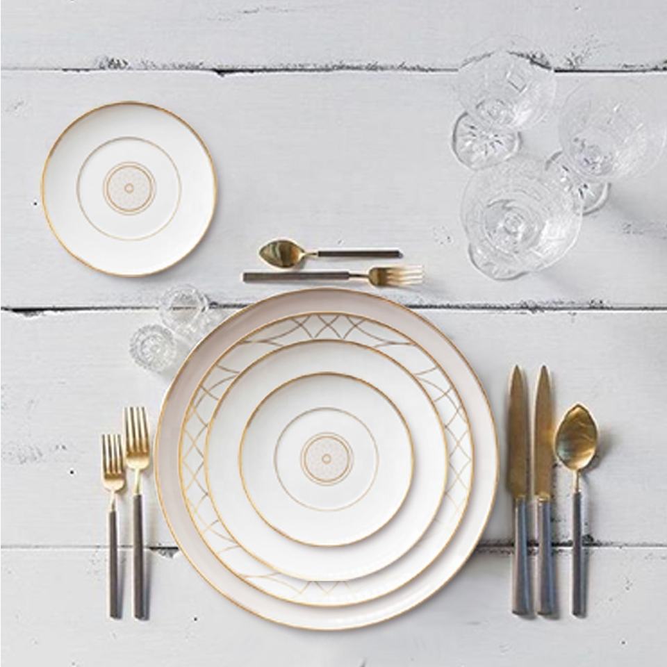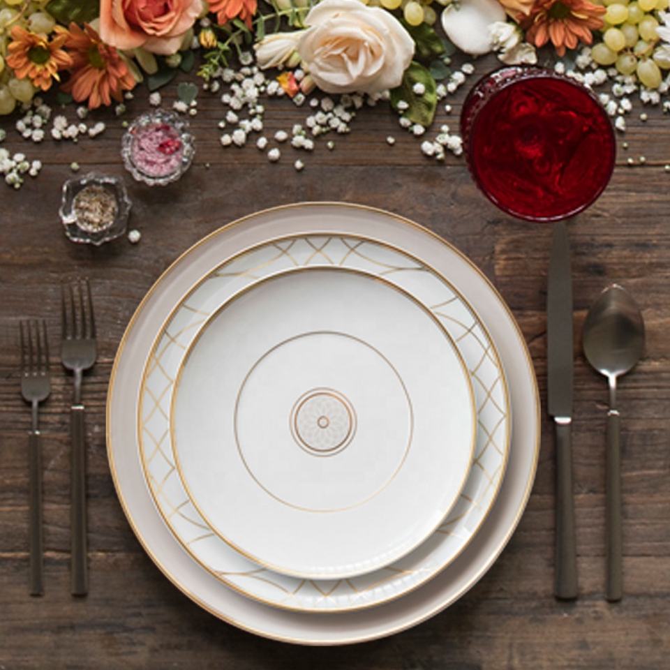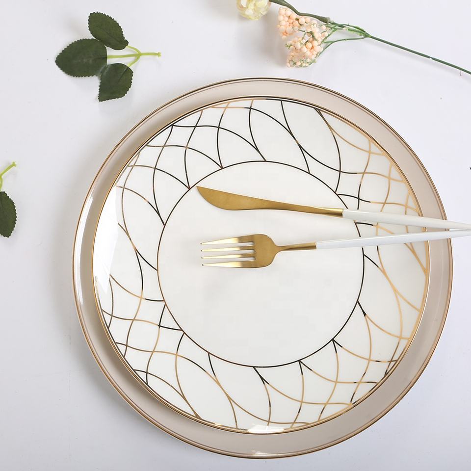 Assiettes de service de luxe en céramique dorée brillante et mate, vente en gros, bord doré, vaisselle en porcelaine fine, ensembles de vaisselle