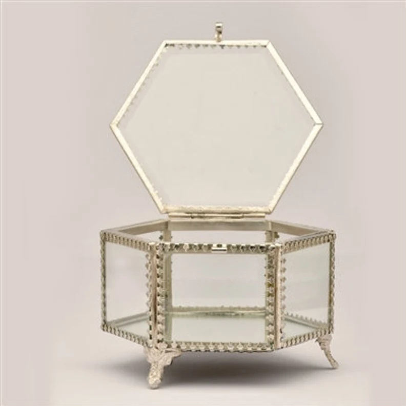 Boîte à bijoux en laiton unique de conception en verre biseauté de forme d'hexagone de bordure argentée de vente chaude pour le stockage de boucle d'oreille et le souvenir
