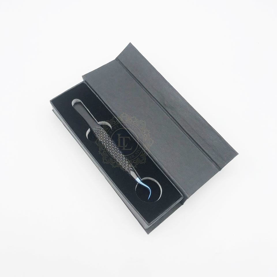 Vente chaude En Acier Inoxydable Cils Pince À Épiler Diamant Motif Étiquette Personnalisée Revêtement En Poudre Noire Point Bleu Fichier Carte Boîte Emballage