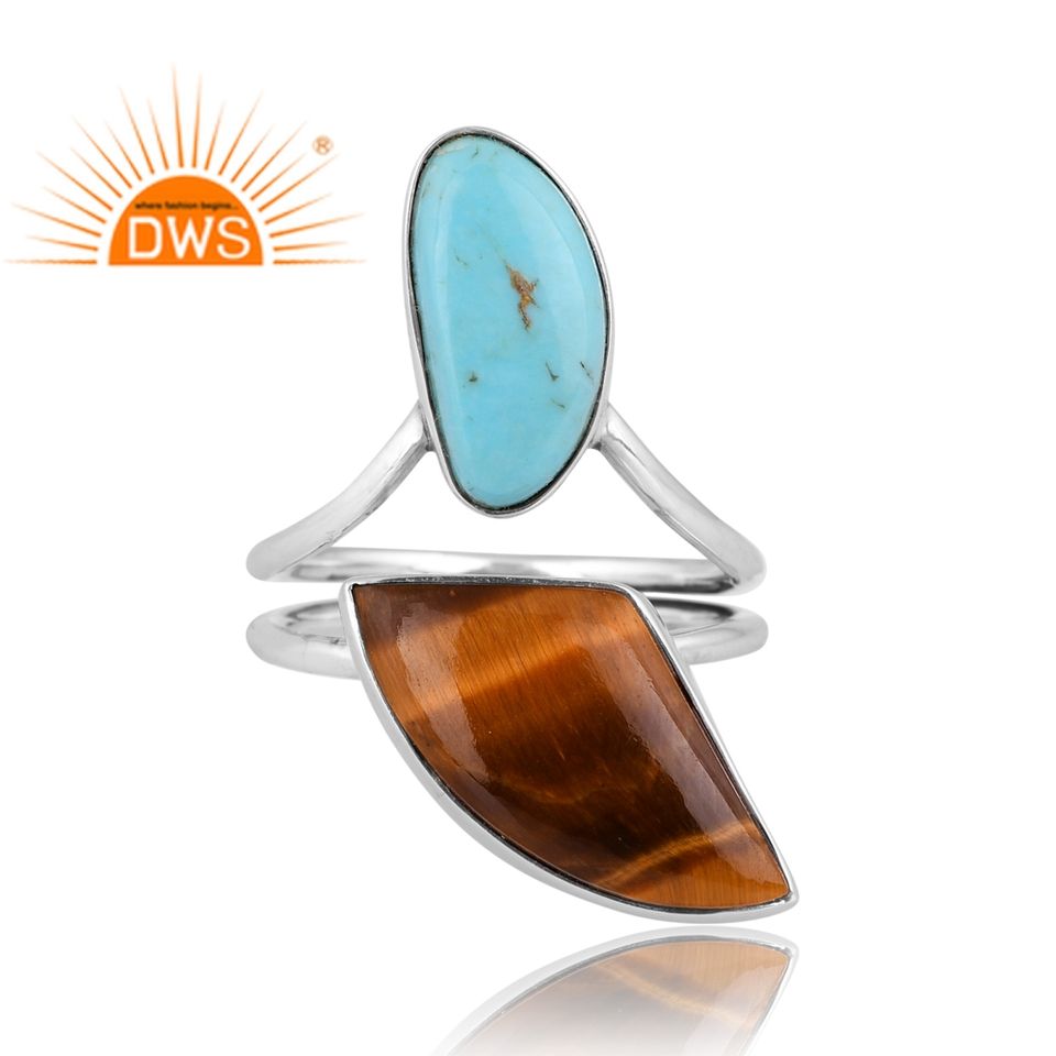 Vente chaude en argent sterling naturel oeil de tigre jaune et bague en pierres précieuses Kingman Turquoise pour les femmes fournisseur de bijoux personnalisés