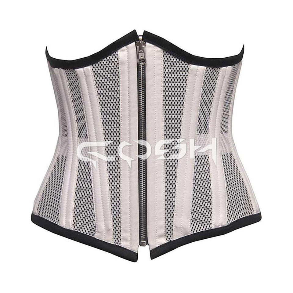 Corset blanc à dos en résille et laçage, avec fermeture éclair antique sur le devant, très tendance