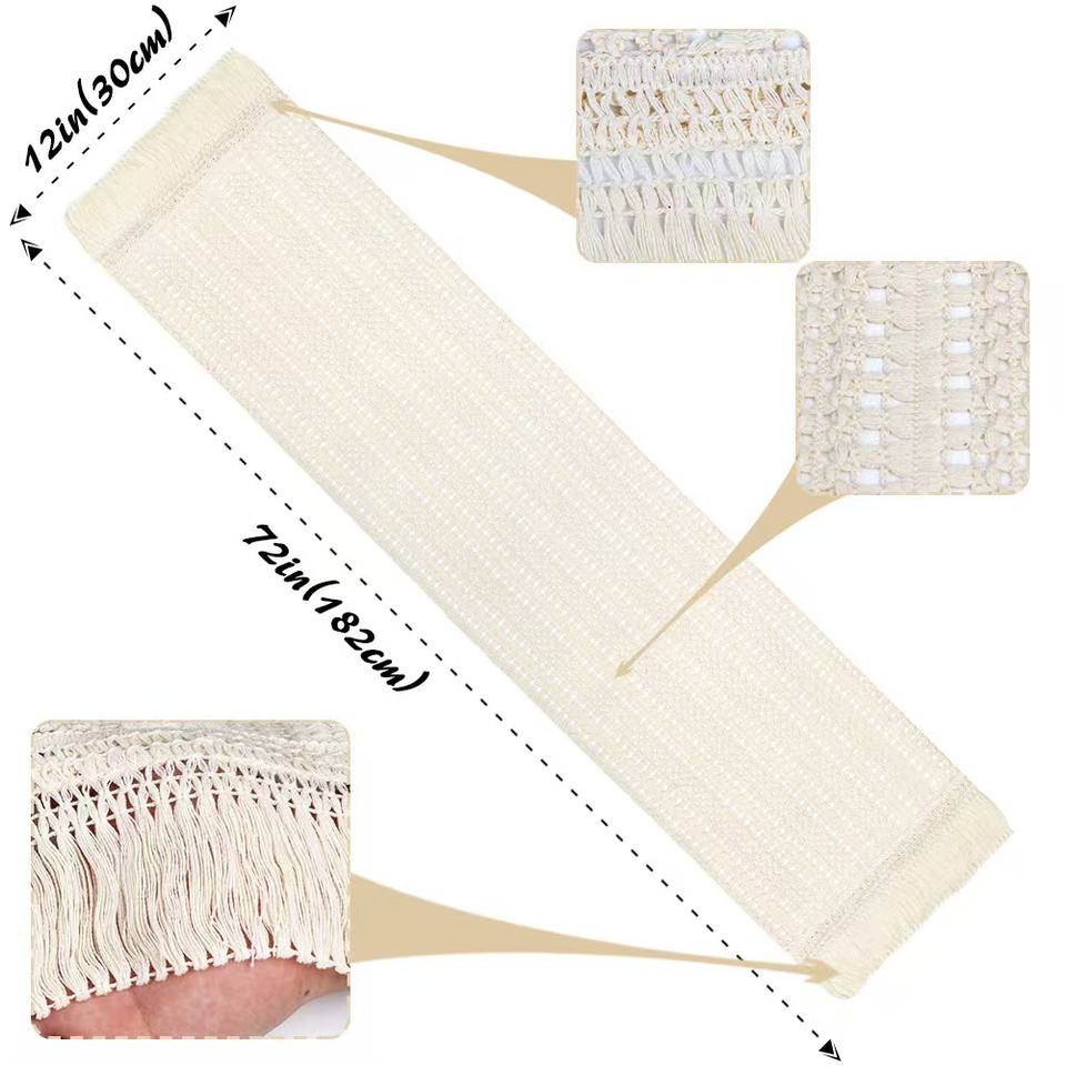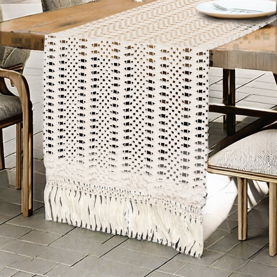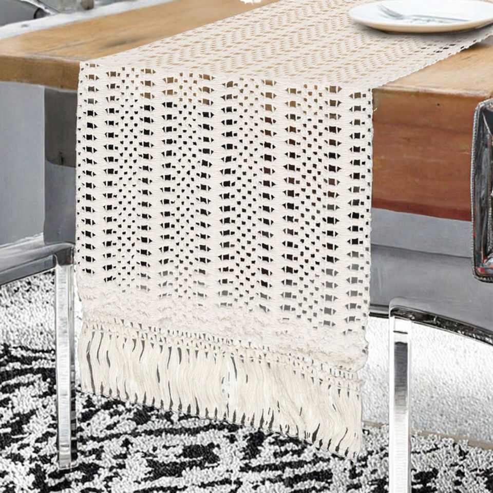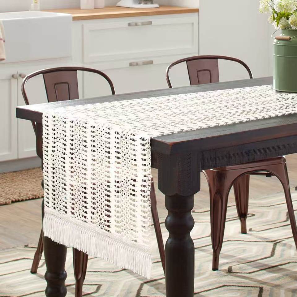 Chemin de table en maille blanche de vente chaude avec style de paillettes de gaze de conception de gland tissé creux géométrique pour une scène de salle à manger chaude