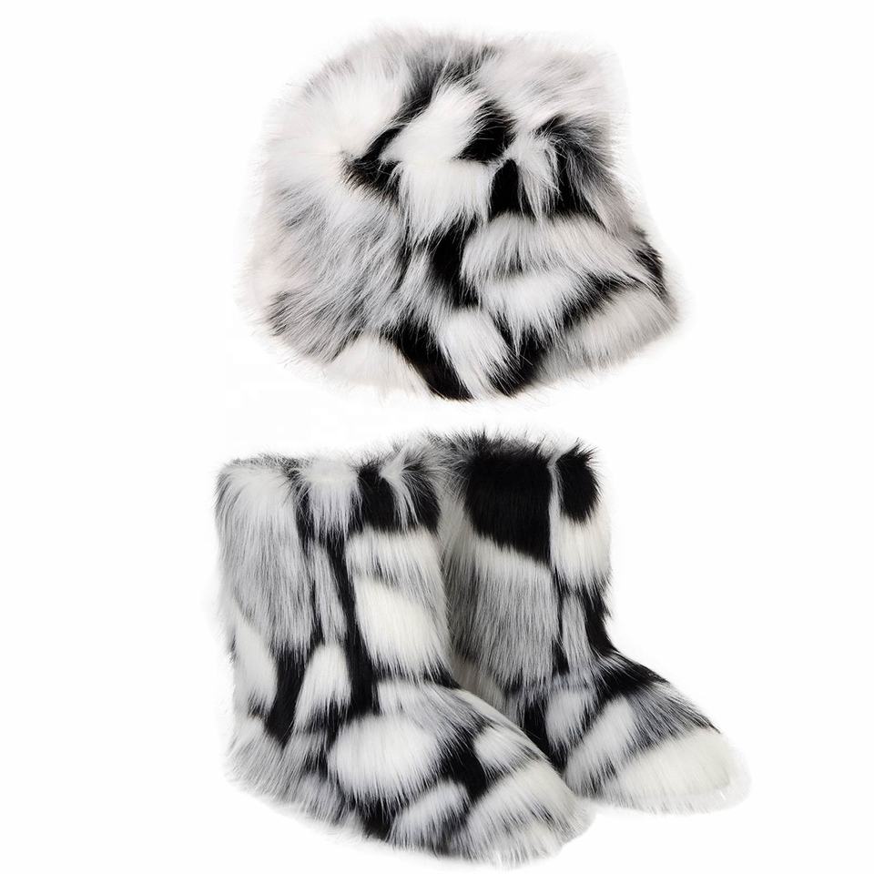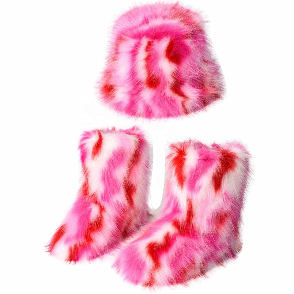 Ensemble chaud et moelleux pour l'hiver, bottes en peluche colorées et chapeau de pêcheur, chapeau seau en fourrure tie-dye, ensembles de bottes de neige en fourrure