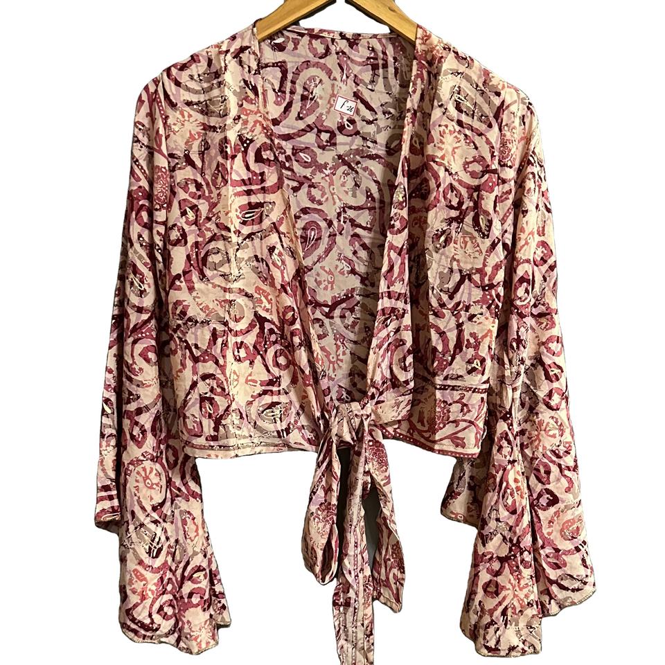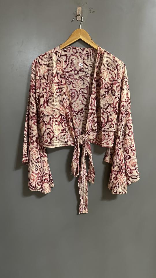 Hot Selling Women Deep V Tie Up Long Bell Sleeve Shirt Casual Pure Silk Wrap Tie Top Blouse Summer Wear Crop Top