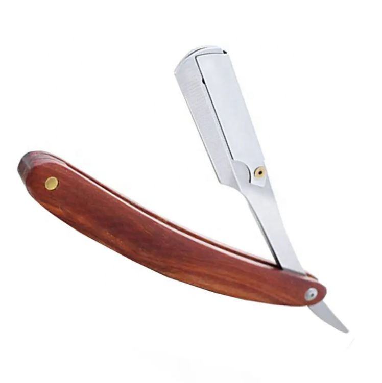Rasoir à lame droite en acier inoxydable à manche en bois, très vendu, avec étui en cuir pour barbiers professionnels et soins du corps