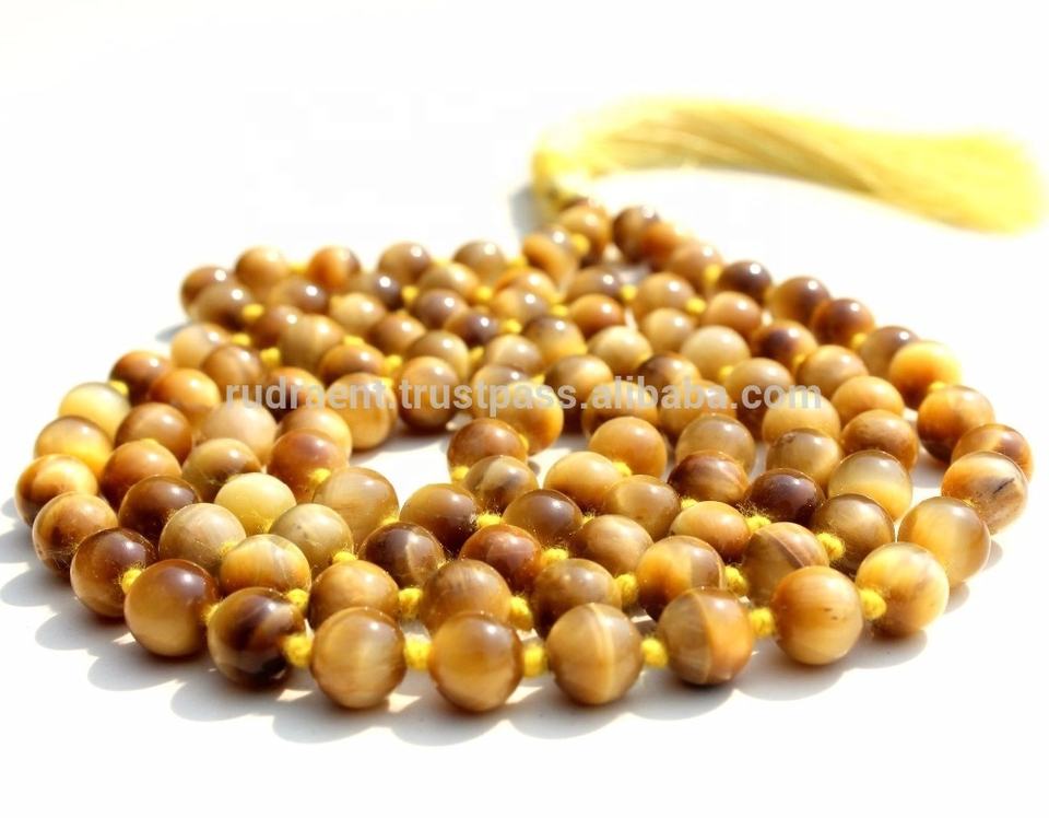 Collier Mala à œil de chat jaune, perles rondes nouées, colliers de perles d'artiste indien faits à la main, offre spéciale