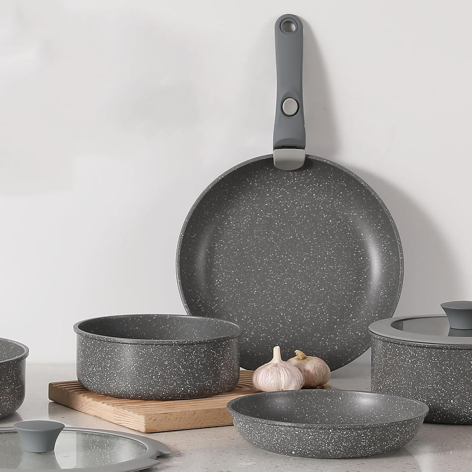 Hot Selling in Japan Marble Non-Stick Cookware Set with Removable Handle and Silicone Lid Glass Material Gas Stove Applicable