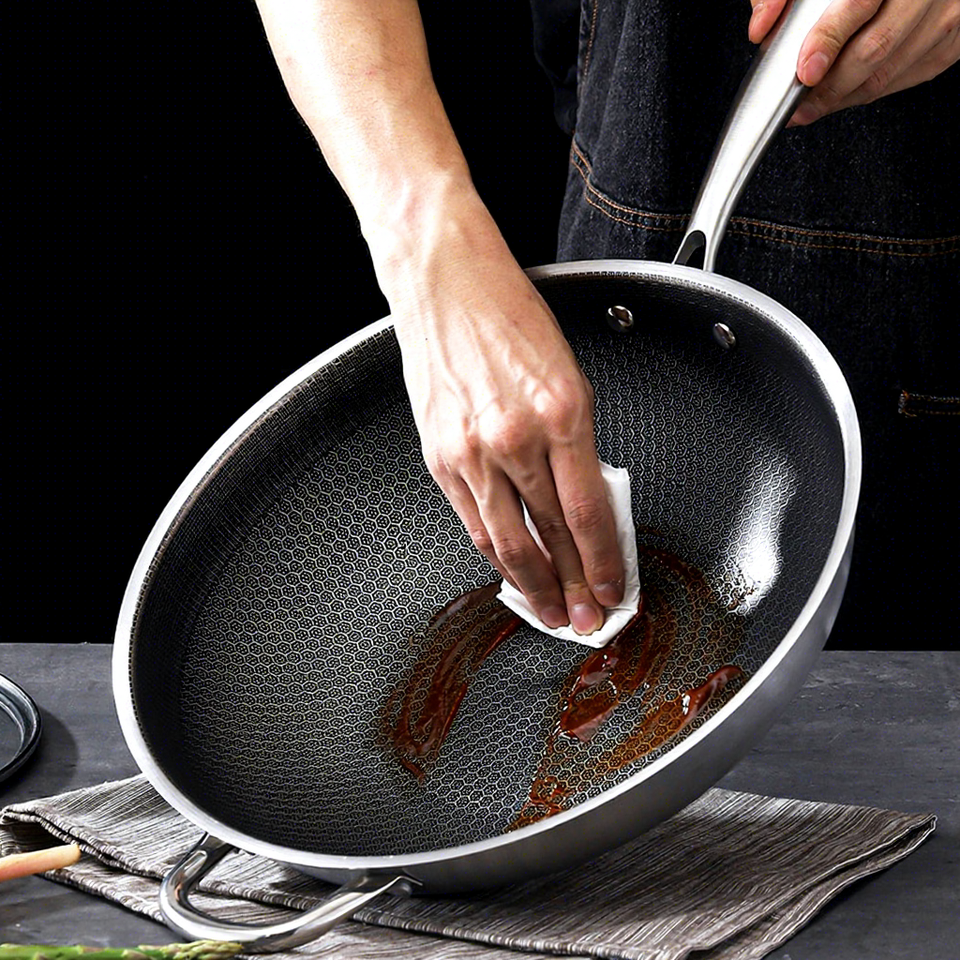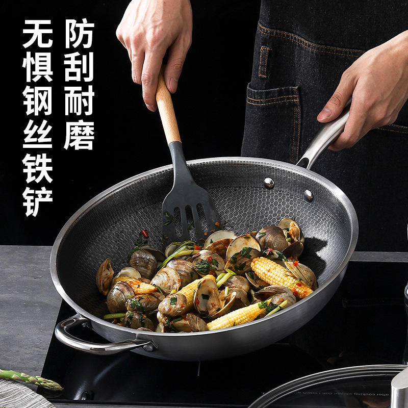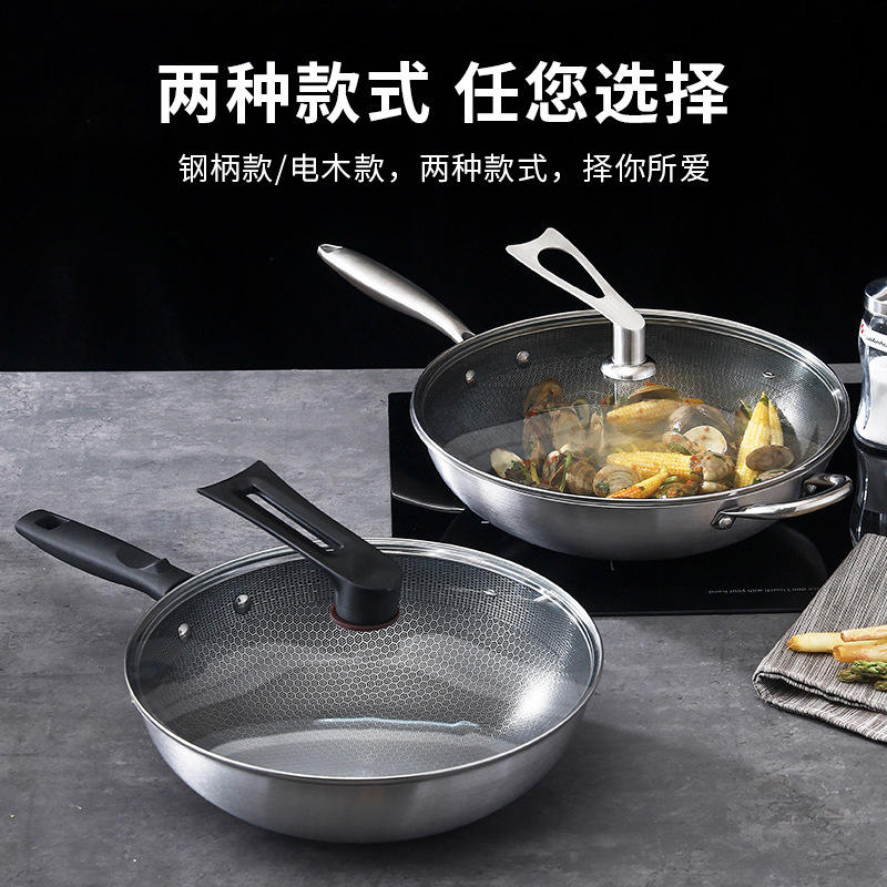 Wok de cuisine antiadhésif en nid d'abeille double face en acier à trois couches avec couvercle en verre pour la friture et la cuisson
