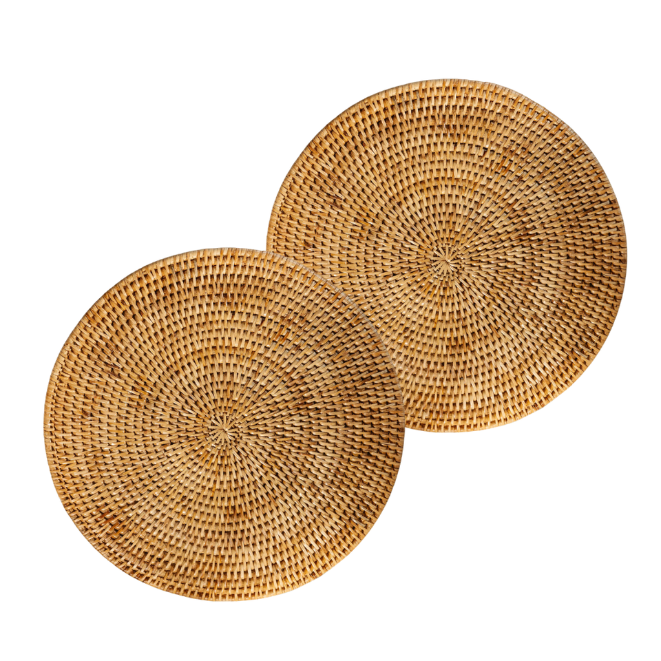 Tendance du moment : assiettes de présentation en rotin tissé, sets de table, accessoires de salle à manger tissés à la main pour un style bohème