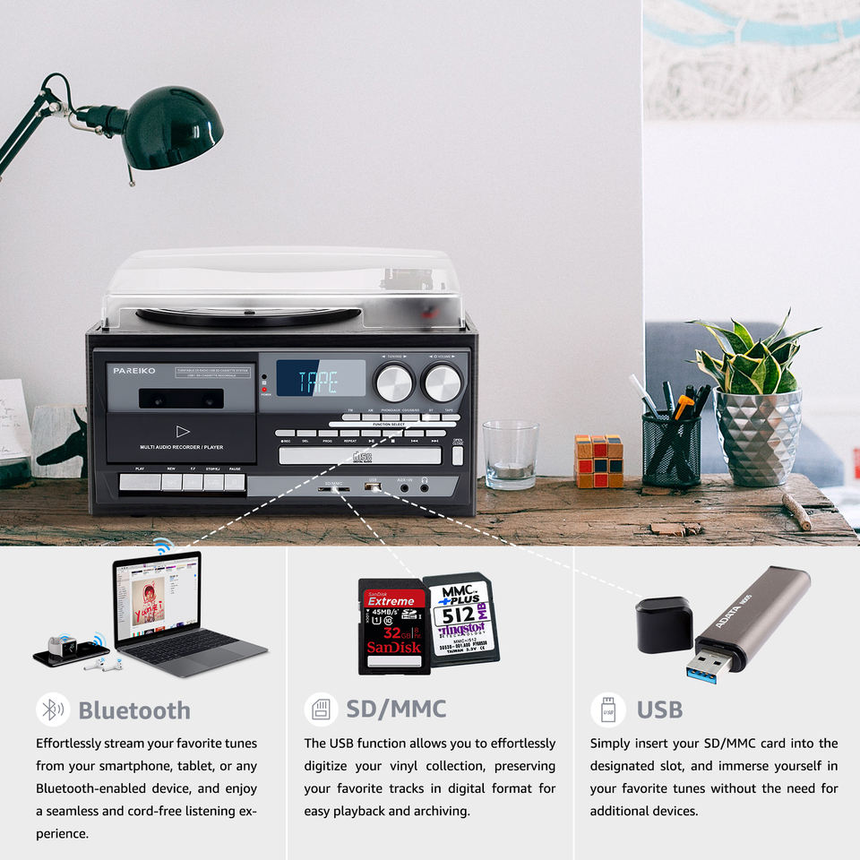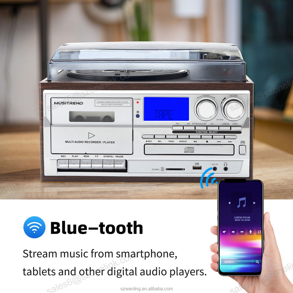 Lecteur de disques vinyles, radio AM/FM, lecteur CD, enregistreur USB et cassette, entrée auxiliaire, sortie RCA pour le marché européen