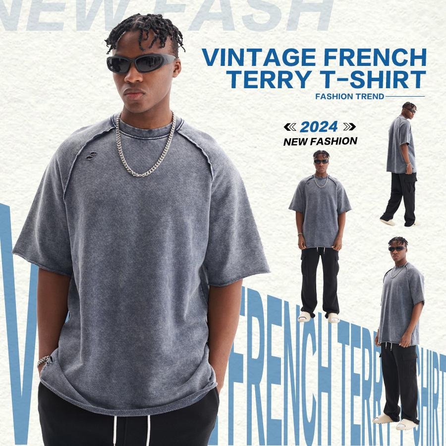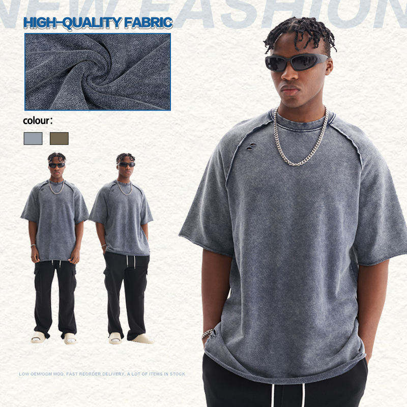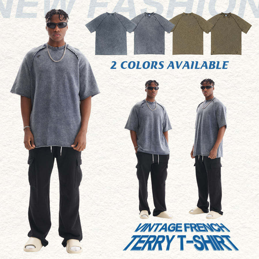 Hot Vintage Style Haute Qualité Raglan Poids Lourd Bord Brut Poignets Ourlet Déchiré Tee Chemises À Manches Courtes T-shirt