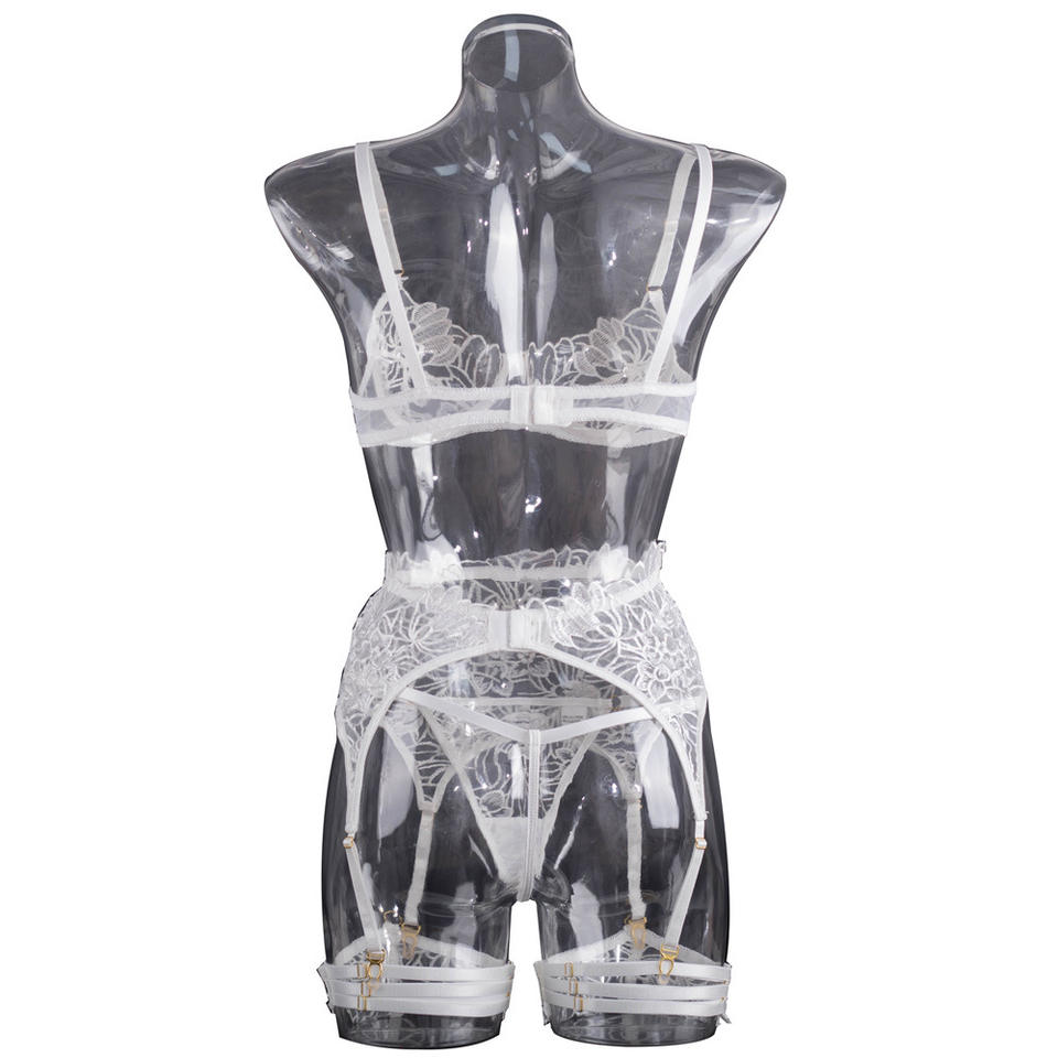 Nouvel ensemble de lingerie transparente en maille blanche, sexy, avec dentelle brodée florale et effet push-up, quatre pièces