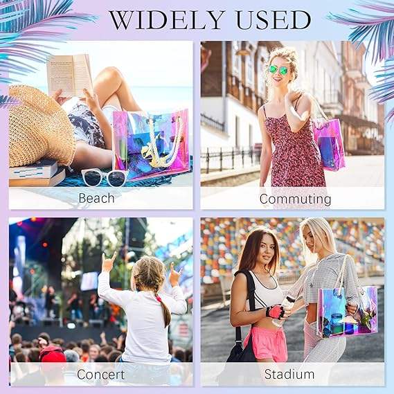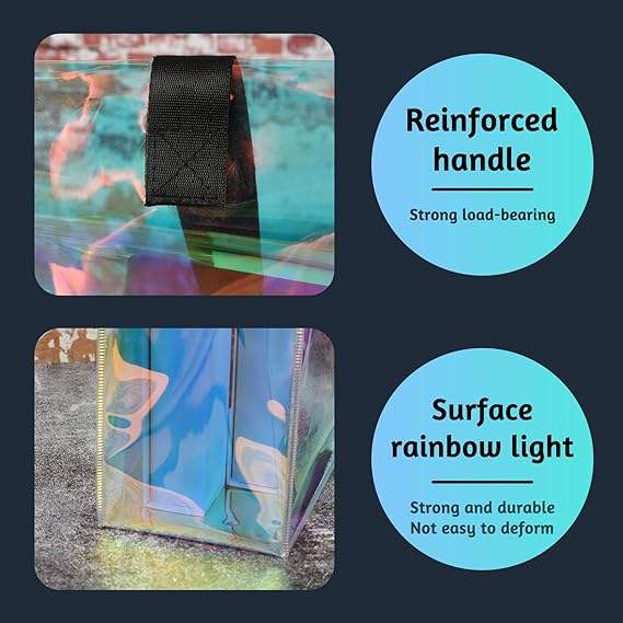 Sac transparent holographique en PVC imperméable avec poignée en corde, idéal pour le travail, la plage, le déjeuner, les mariages, les anniversaires, motif arc-en-ciel