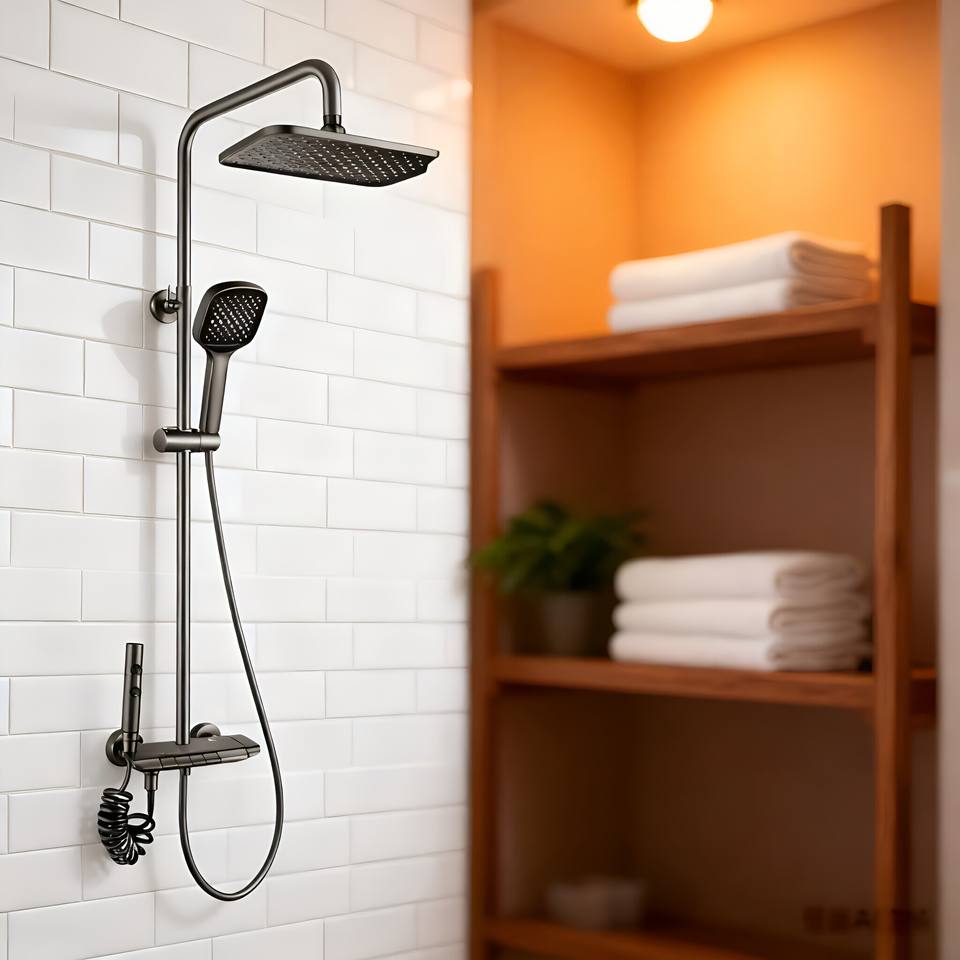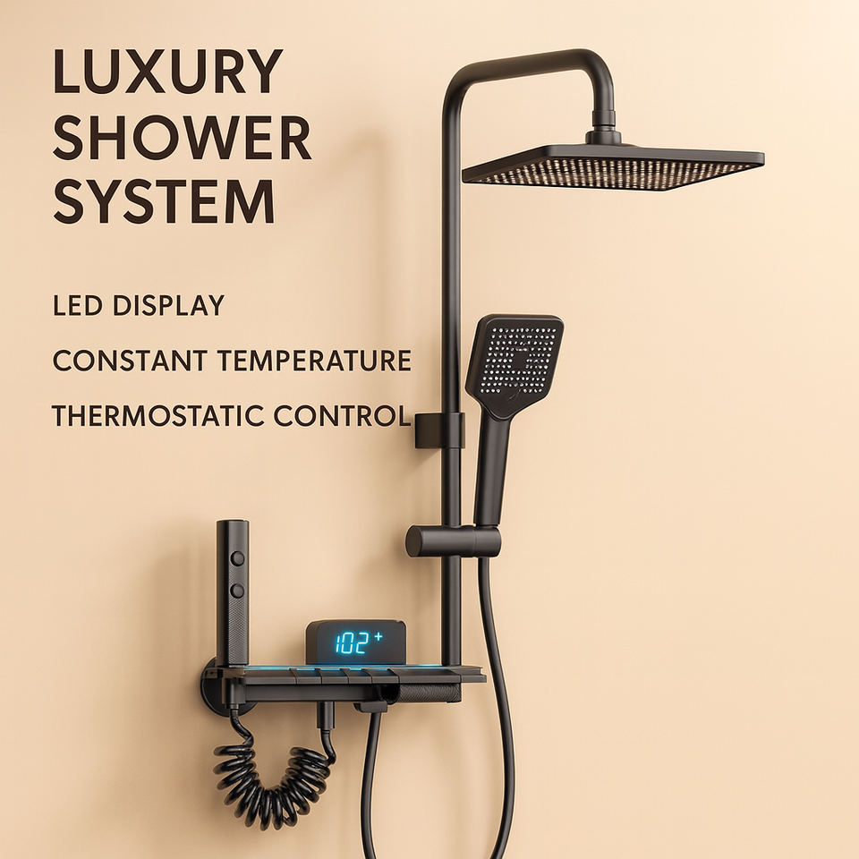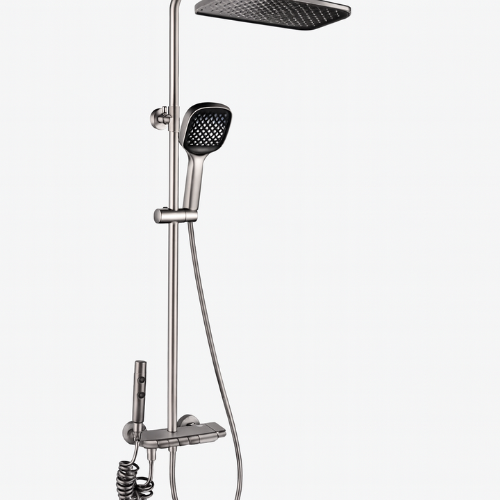 Ensemble de douche exposé avec clavier de piano à affichage numérique, pomme de douche de style pluie gris canon, mitigeur de salle de bain, vente chaude