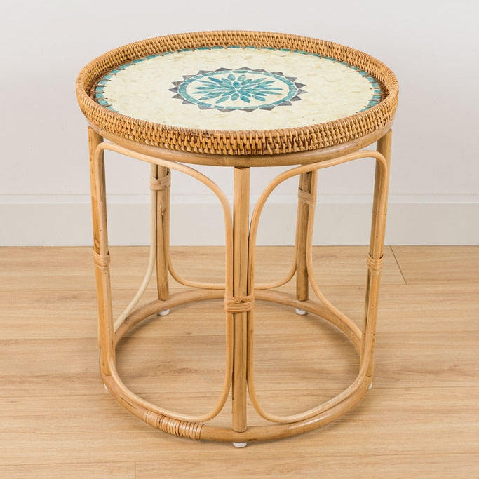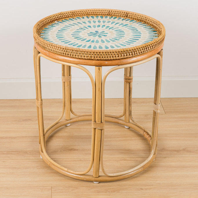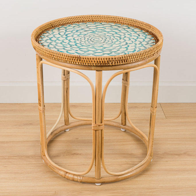Hot trend round rattan wood coffee table with mother of pearls inlaid top for living room decoration