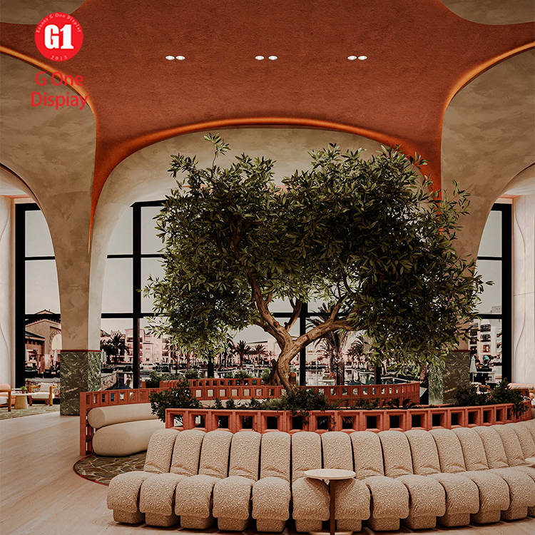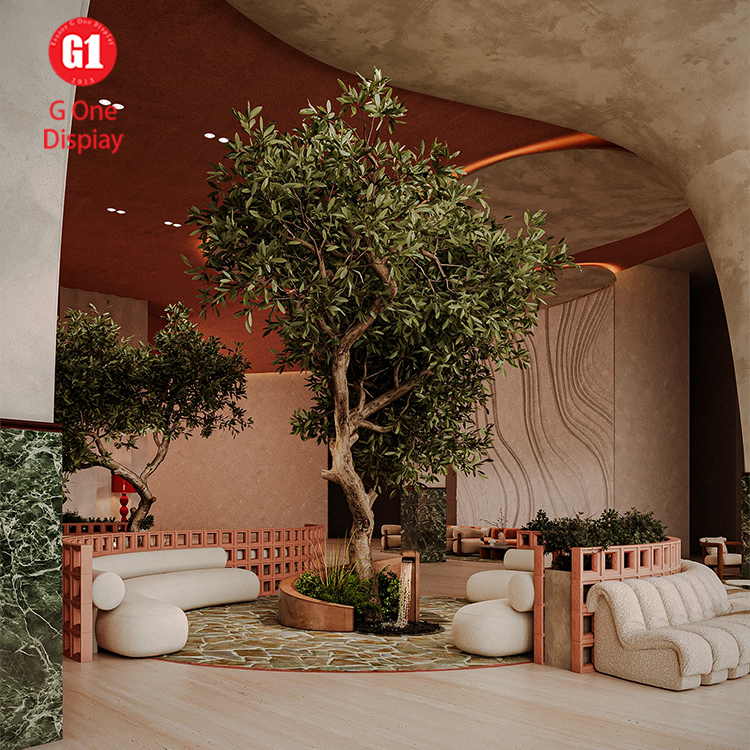 Conception d'entrée d'hôtel, conception personnalisée de salle à manger, bureaux de réception haut de gamme écologiques, comptoir de bar artistique avec éclairage LED