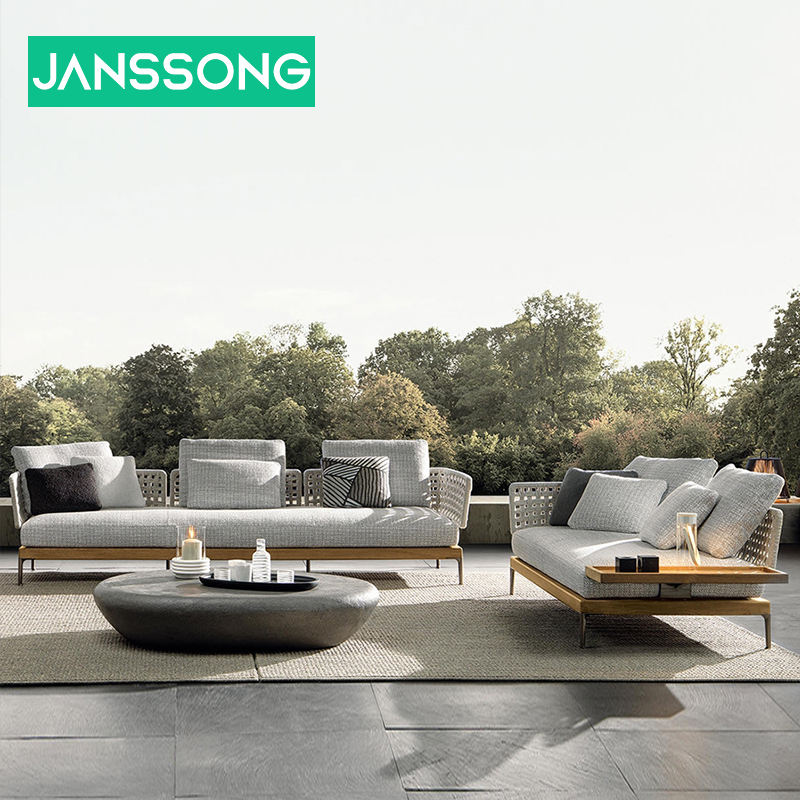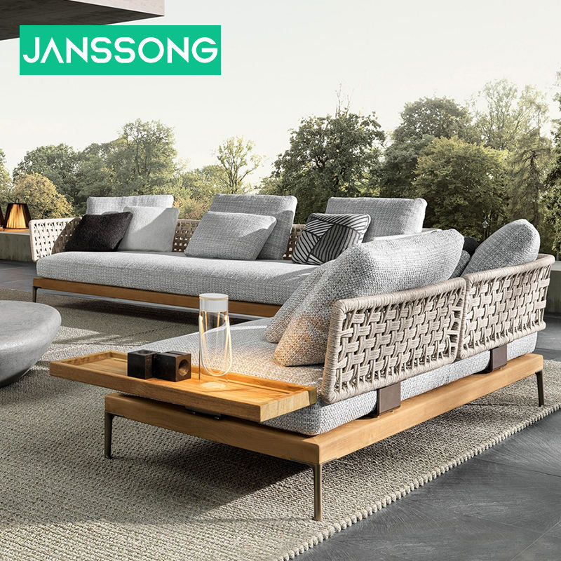 Ensemble de canapé d'extérieur en corde tissée à la main pour hôtel Meubles d'extérieur en teck pour jardin, terrasse, cour, coussin imperméable en bois massif