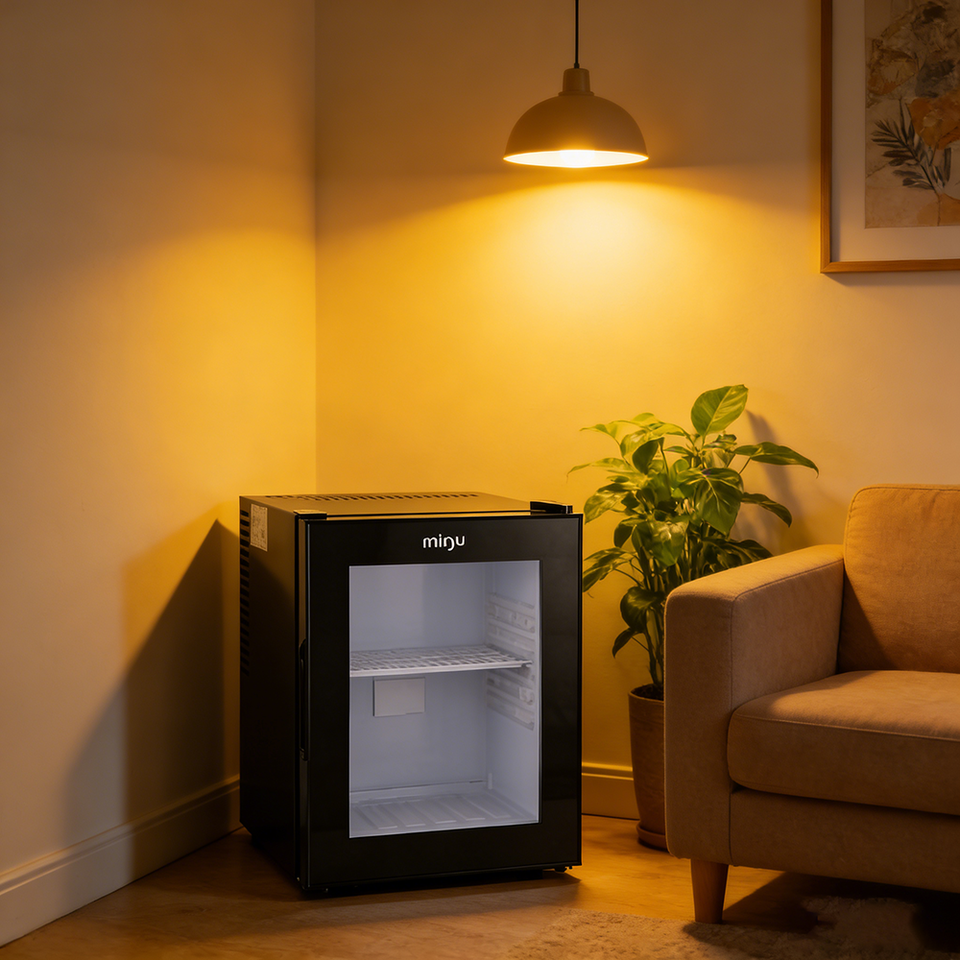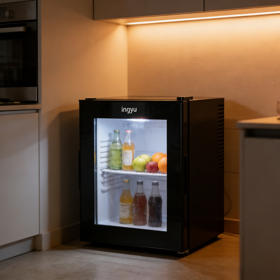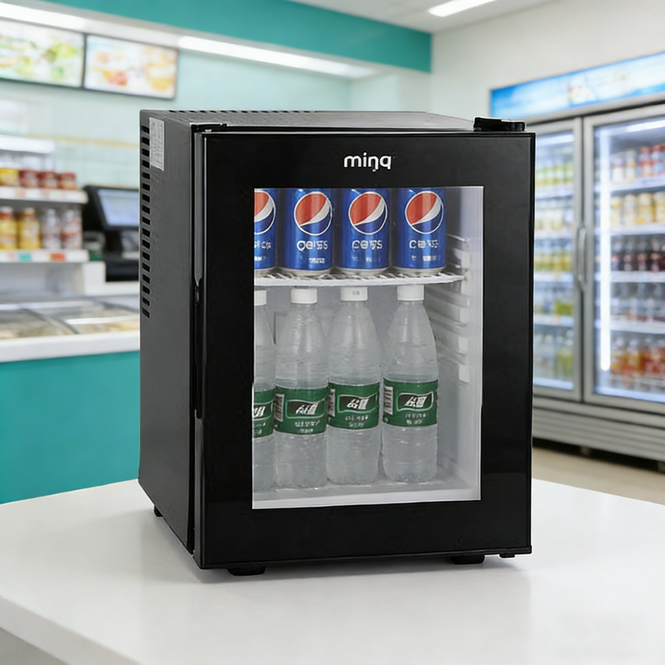 Mini-réfrigérateur commercial pour hôtel, 30L, silencieux, à refroidissement semi-conducteur, porte vitrée, faible température, appareil de bureau