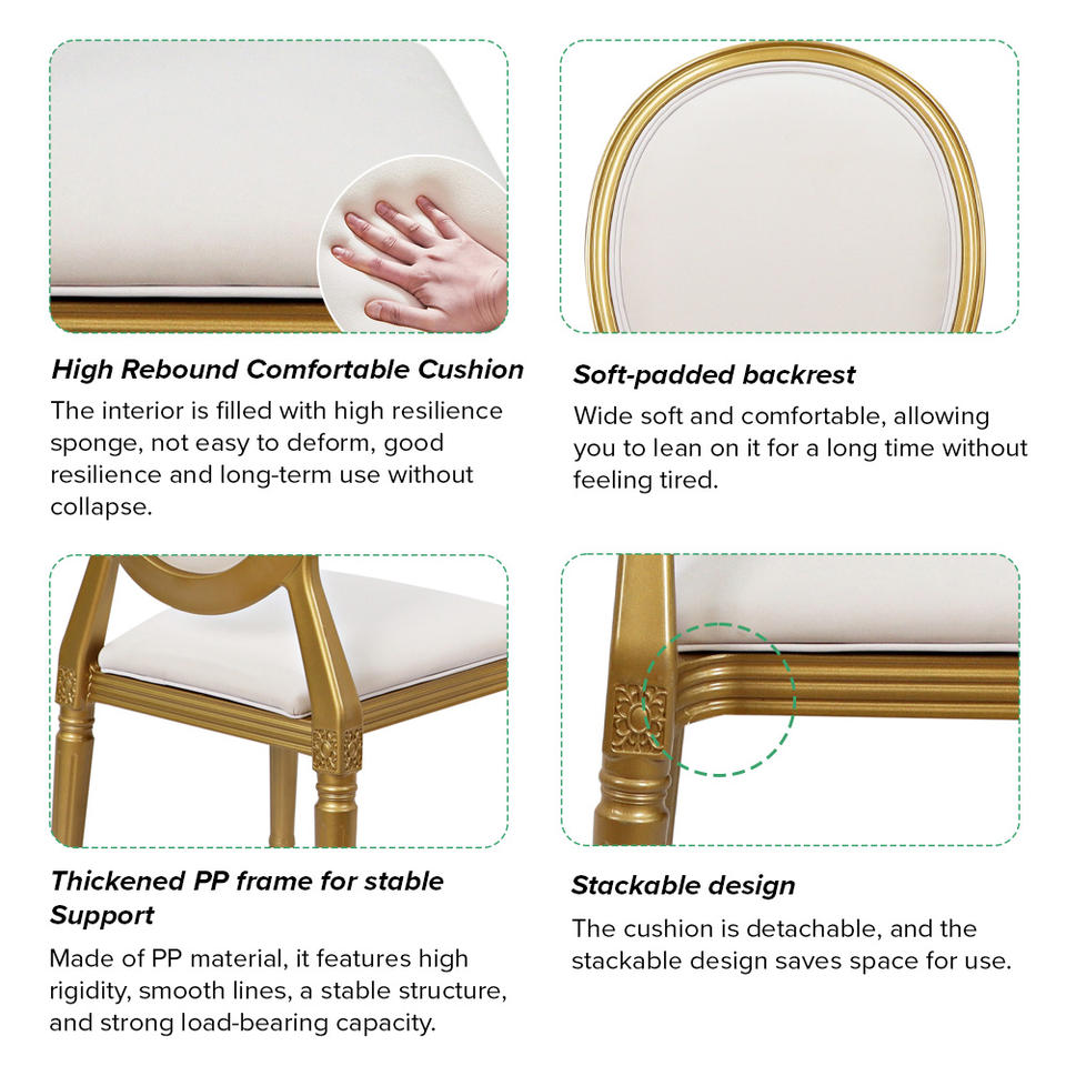 Chaises de salle à manger empilables pour hôtels, restaurants et maisons, dossier ovale, chaises Louis dorées, chaises en résine plastique rembourrées à vendre