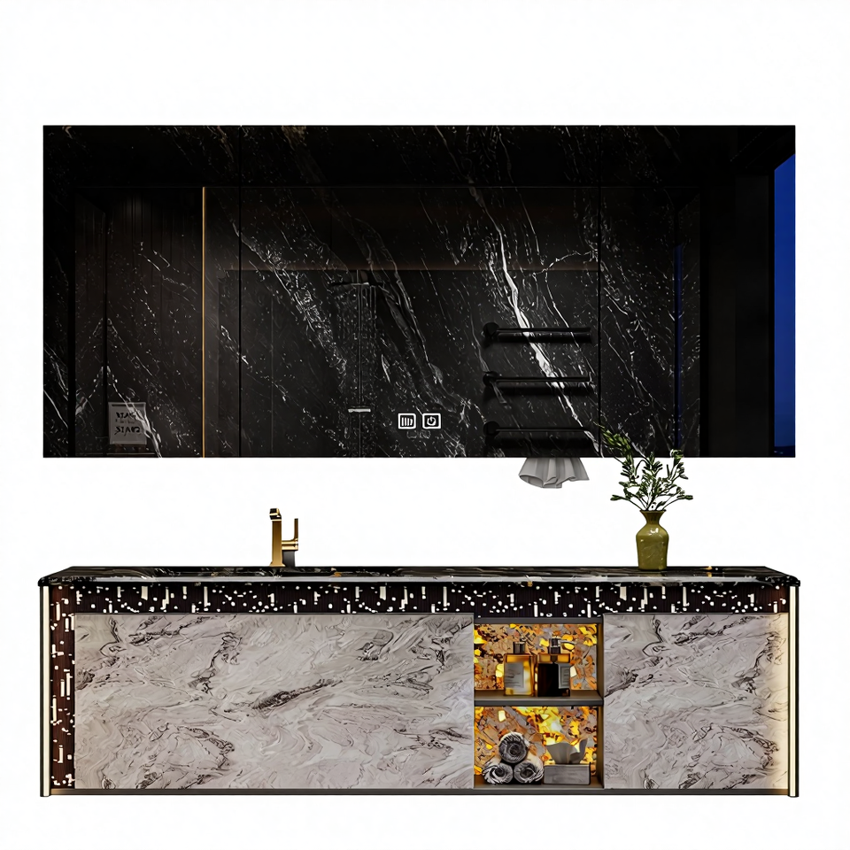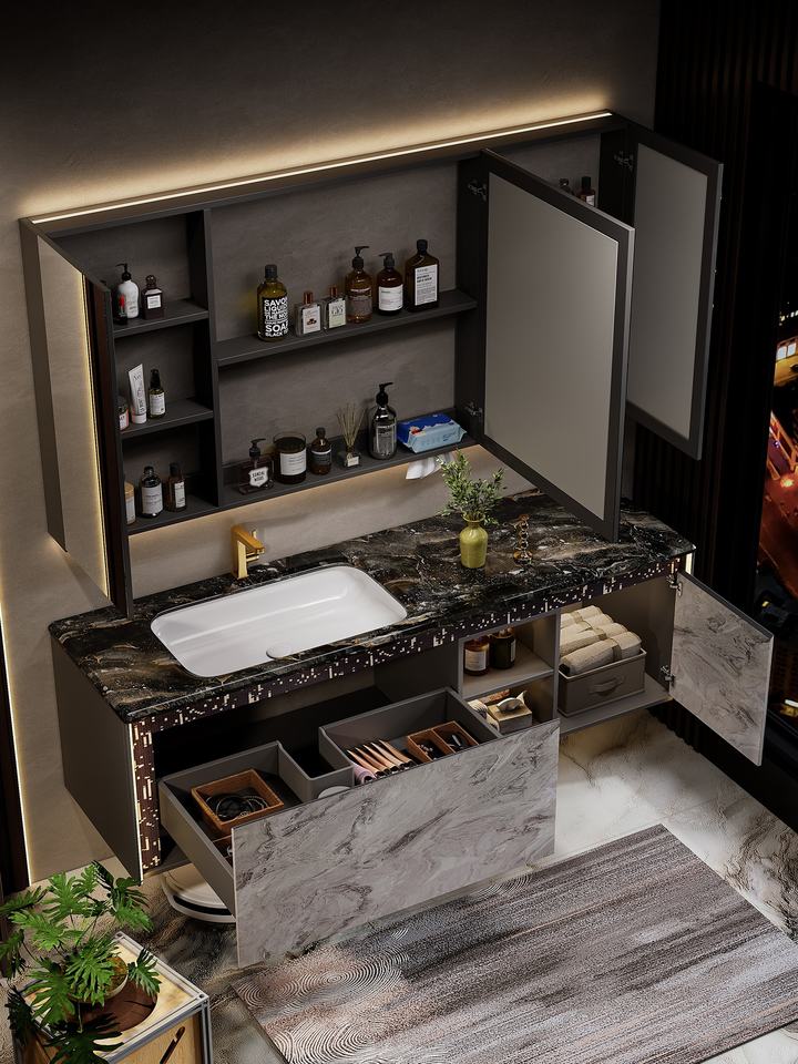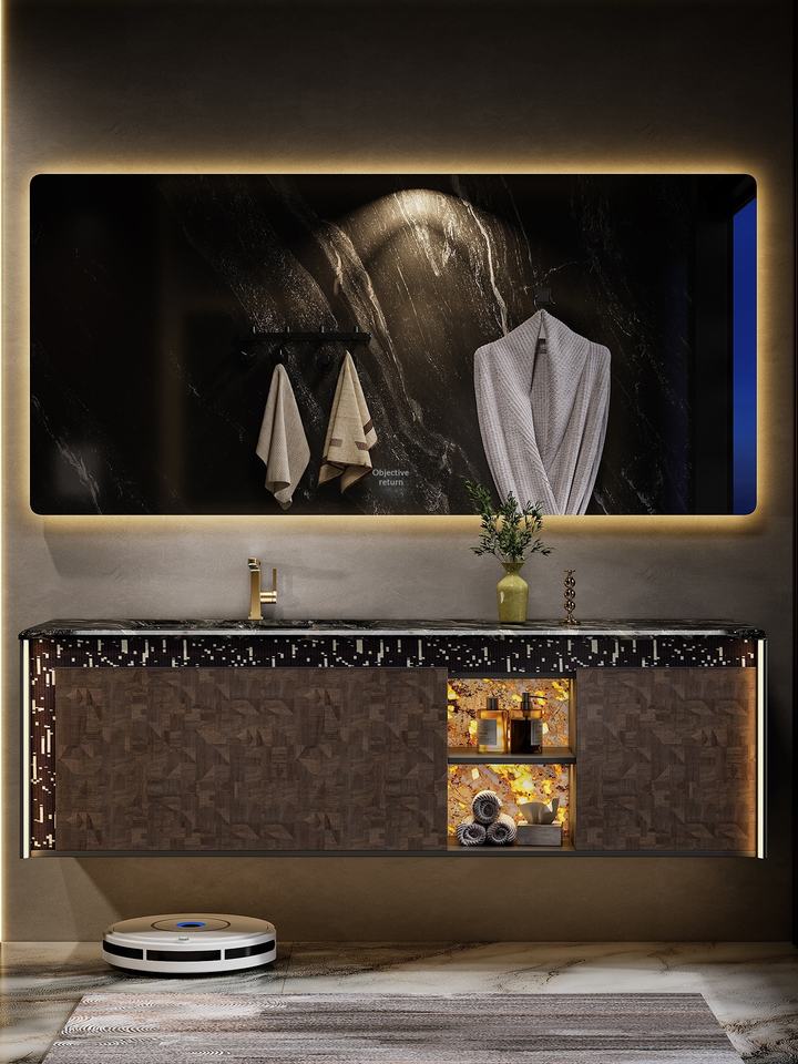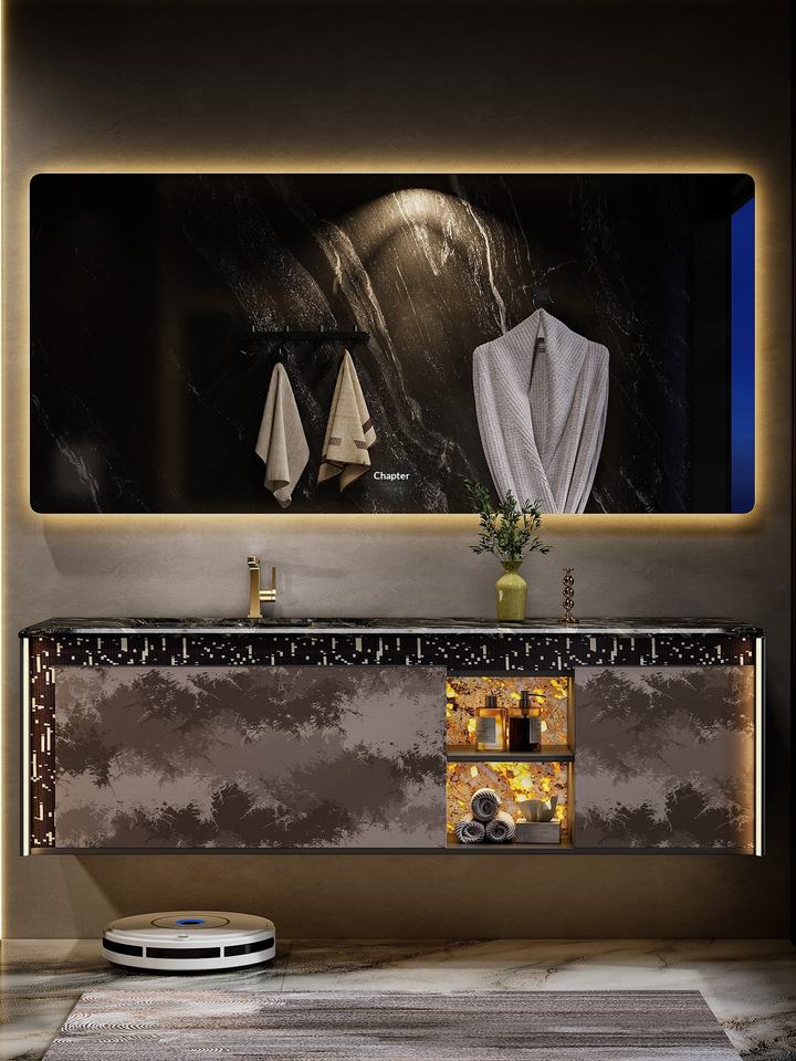Ensemble de meubles de salle de bain de style hôtel avec lavabo en pierre de luxe, meuble de lavabo haut de gamme sur mesure