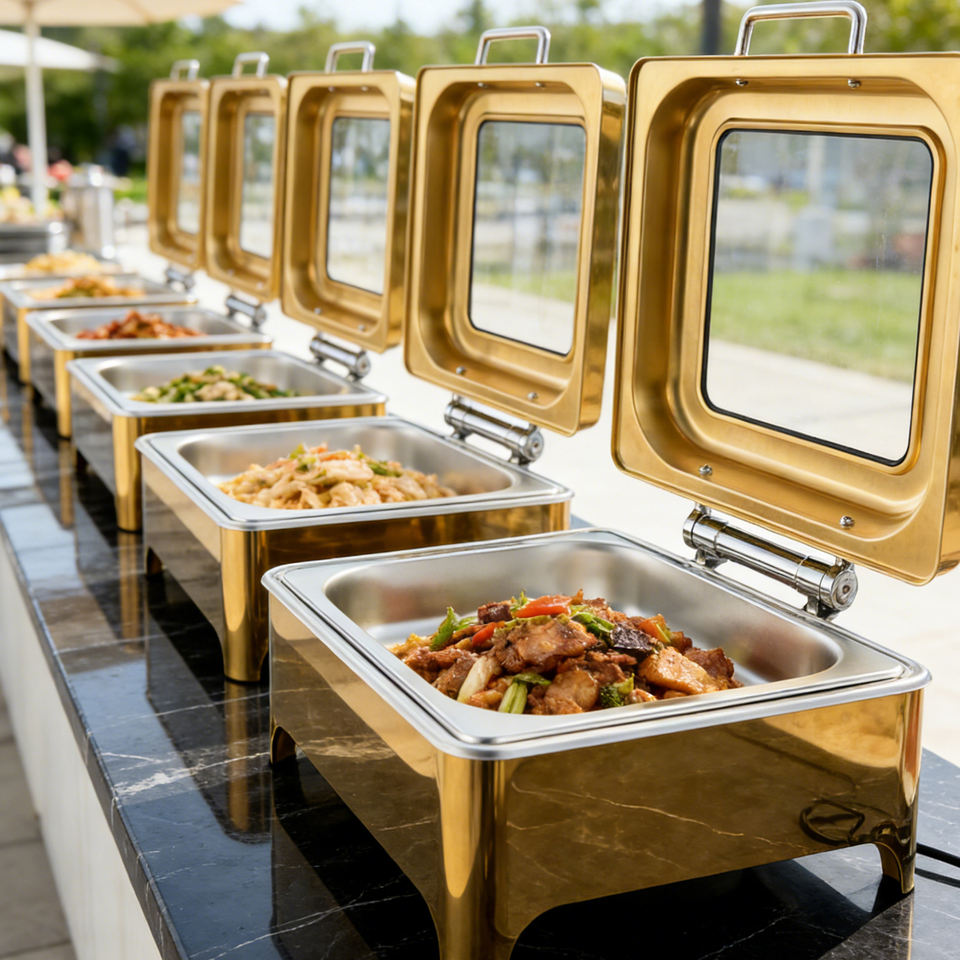 Ensemble de réchauds de buffet de luxe en acier inoxydable doré avec vitrines pour traiteur, idéal pour les mariages et les événements hôteliers
