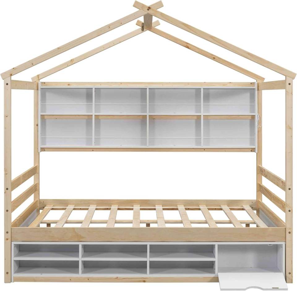 Plate-forme en bois pleine grandeur en forme de maison Cadre de lit 6 étagères Toit de chevet intégré Conception peu encombrante pour le salon à manger des enfants