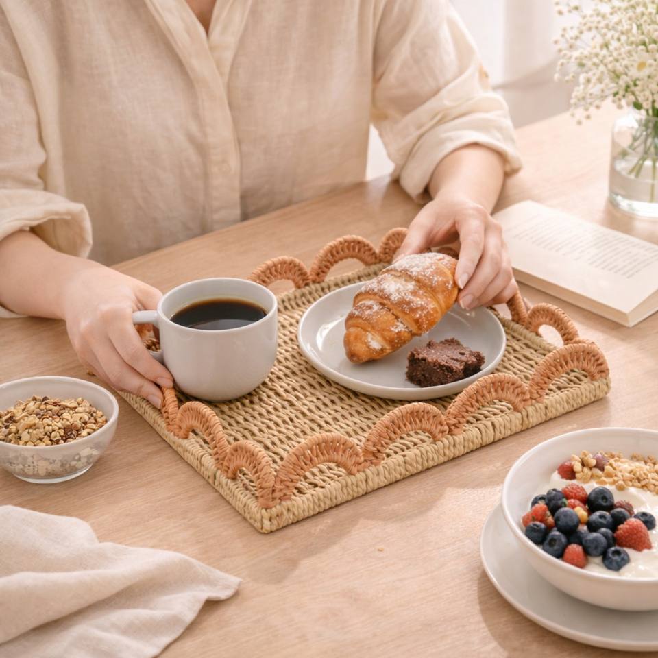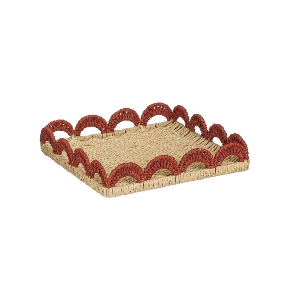 Plateau en corde de papier essentiel pour la maison avec bord festonné, plateaux de service tissés multifonctionnels pour ustensiles de cuisine, fabriqué au Vietnam