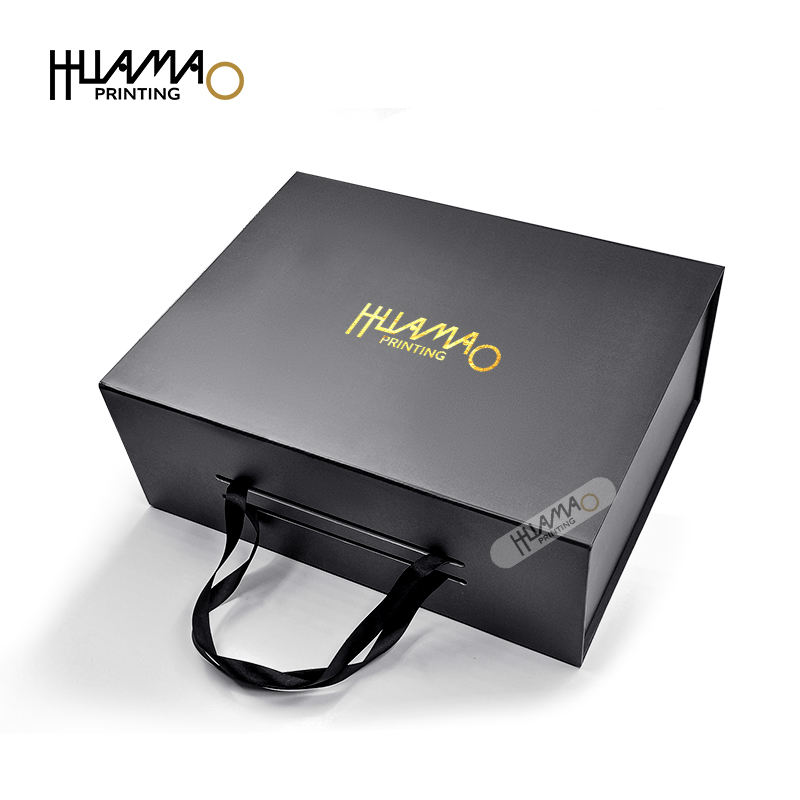 Boîtes d'emballage de chaussures personnalisées Huamao de couleur noire, OEM, pliables avec ruban et fermeture magnétique, logo en feuille d'or pour l'emballage de chaussures