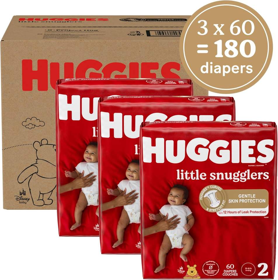 Couches Huggies taille 2, couches pour bébés Little Snugglers, taille 2 (12-18 lbs), 180 couches (3 paquets de 60), l'emballage peut varier
