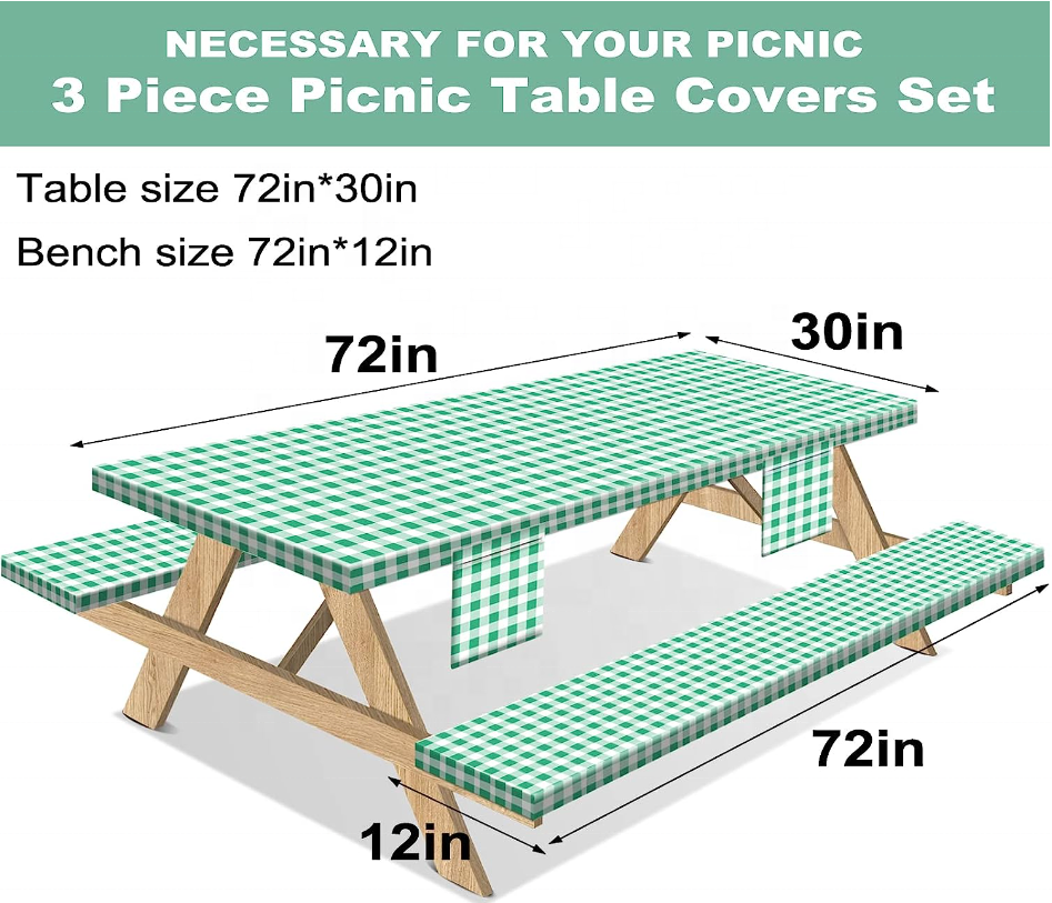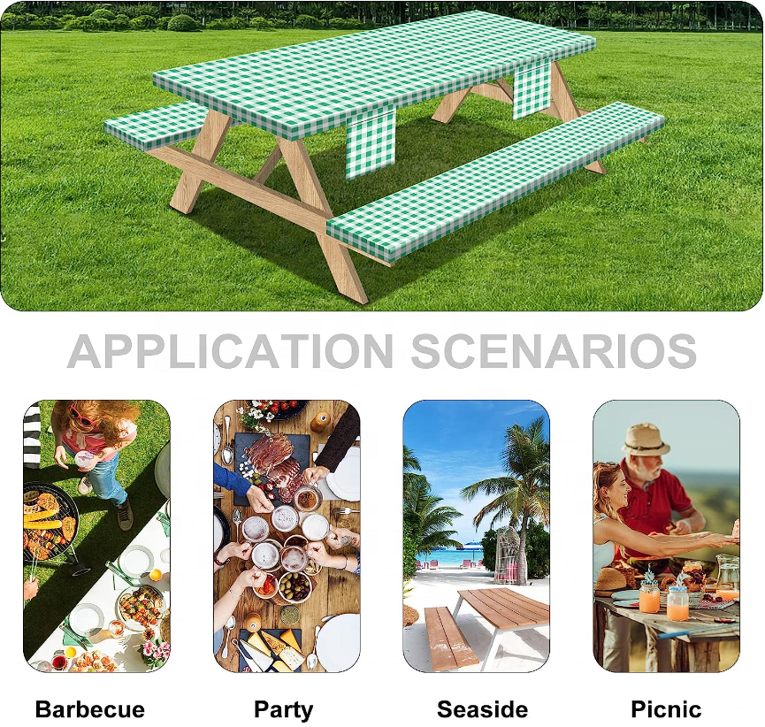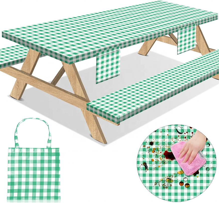 HuiHePicnic Table Cover avec banc couvre 3 pièces ensemble élastique ajusté Rectangle vinyle nappes toile cirée étanche pour l'extérieur