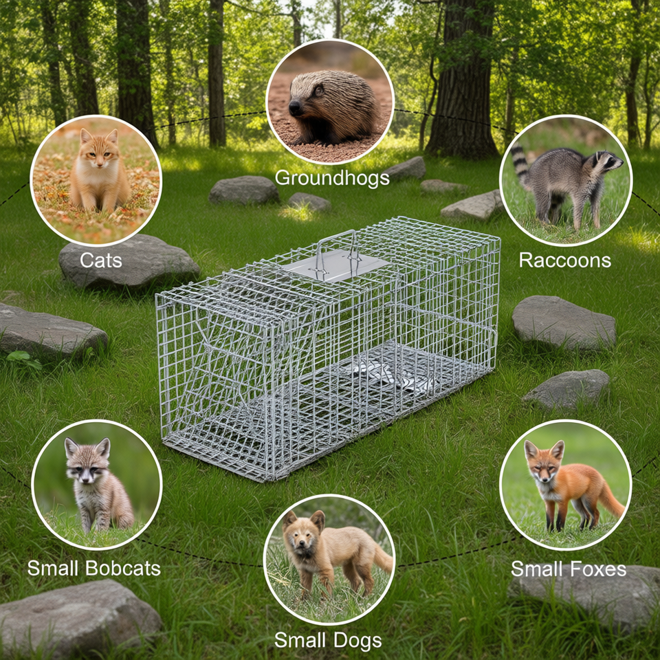 Humane Live Animal Trap Cage Collapsible Galvanized Wire 50 Lb Capacity Outdoor Use for Cats Raccoons Foxes Groundhogs