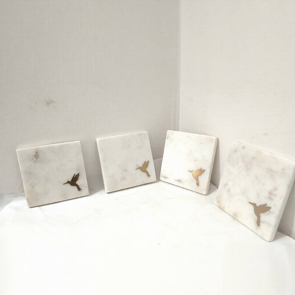 Sous-verres en marbre avec incrustation en laiton motif colibri, sous-verres à thé naturels pour sublimation et incrustation métallique, vente en gros personnalisée