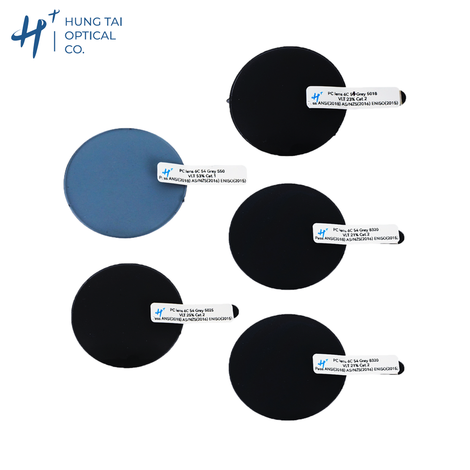 Lunettes de soleil multicolores Hung Tai Optical BSI ISO fabriquées à Taïwan, verres PC avec revêtement HC/HMC/SHMC, vision simple, anti-UV, protection contre les radiations.
