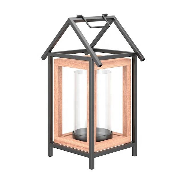 Lanterne en bois à cadre métallique noir en forme de cabane avec couvercle en verre Transparent lanterne en bois naturel de qualité durable