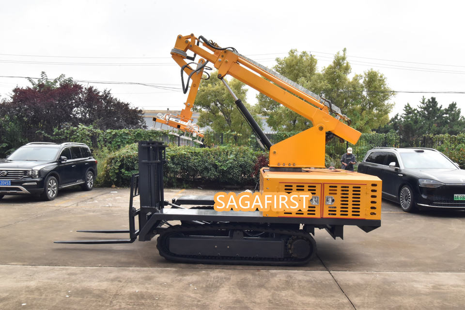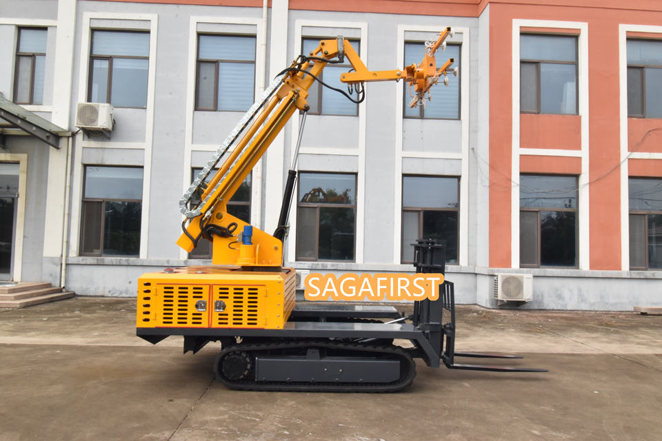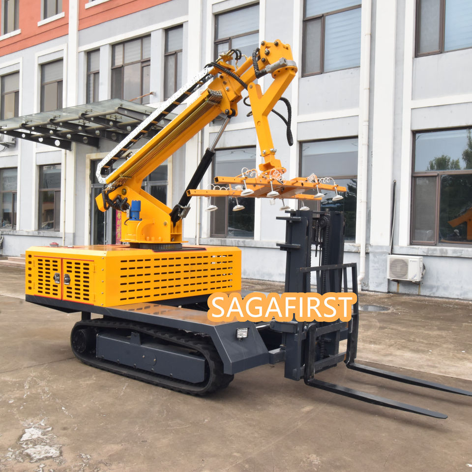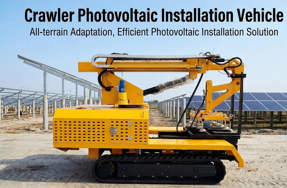 Véhicule d'installation de panneaux photovoltaïques sur chenilles hydrauliques avec aspiration sous vide pour une installation sans casse