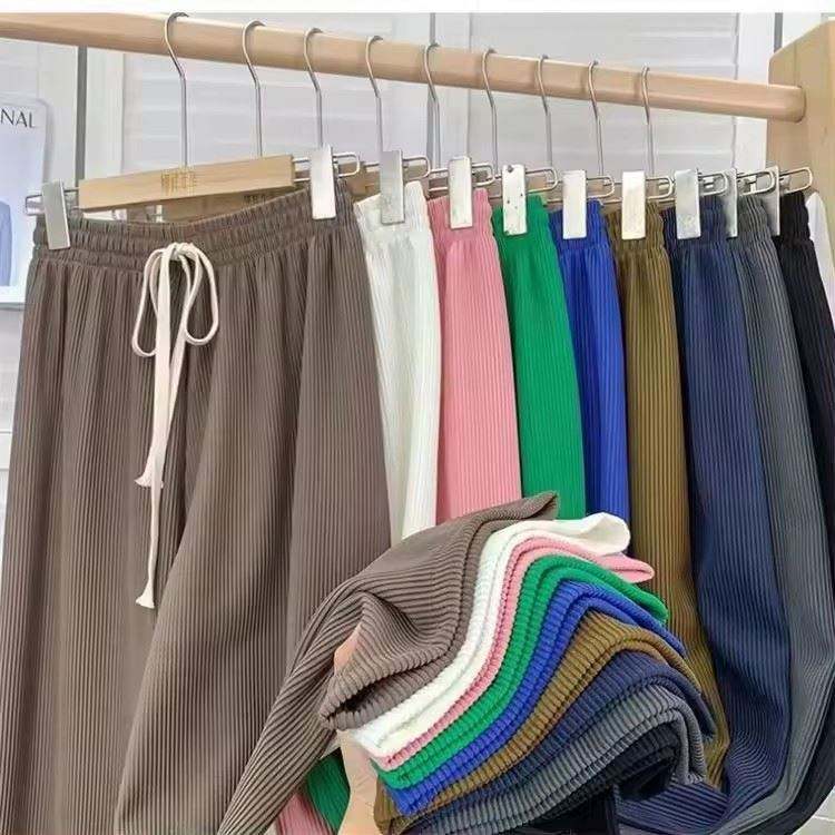 Pantalon long ample en maille côtelée avec cordon de serrage pour femme, taille haute extensible, jambe large, idéal pour l'été - I-0288