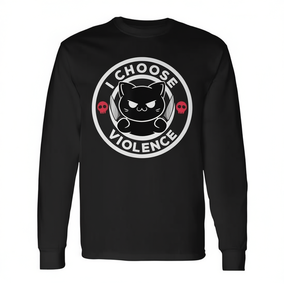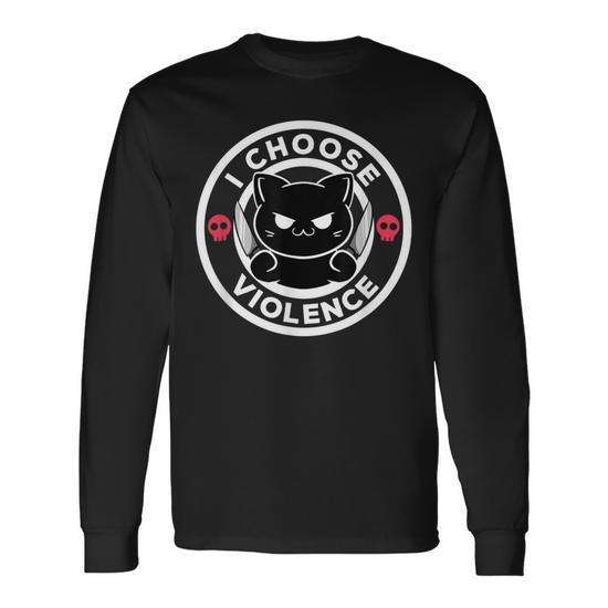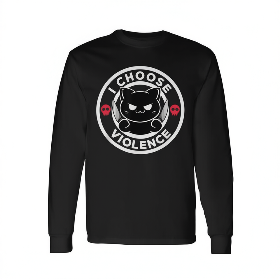 T-shirt à manches longues unisexe I Choose Violence Cat, col rond, imprimé en sérigraphie, design promotionnel