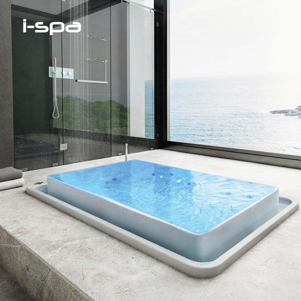 Baignoire îlot carrée en acrylique I-Spa avec débordement intégré, design moderne pour usage spa et bien-être