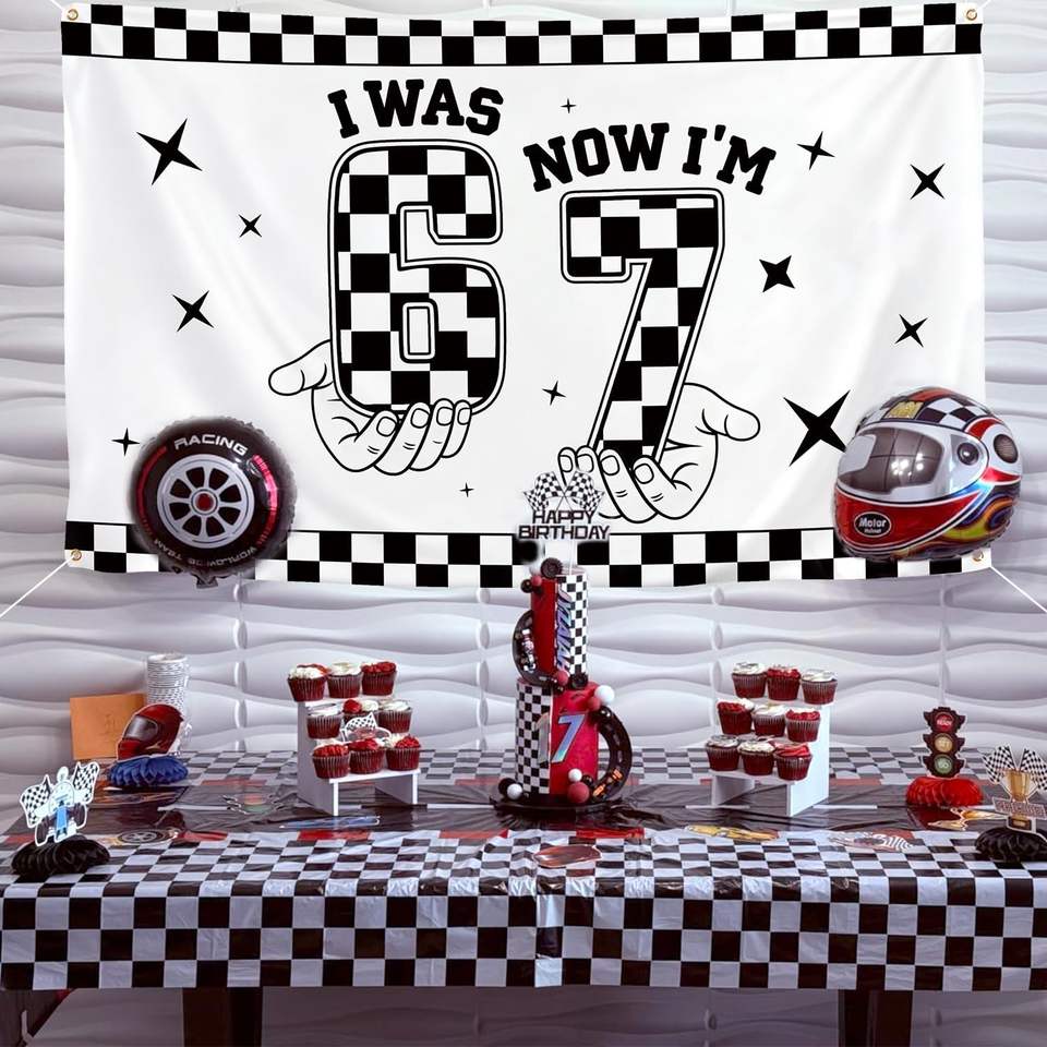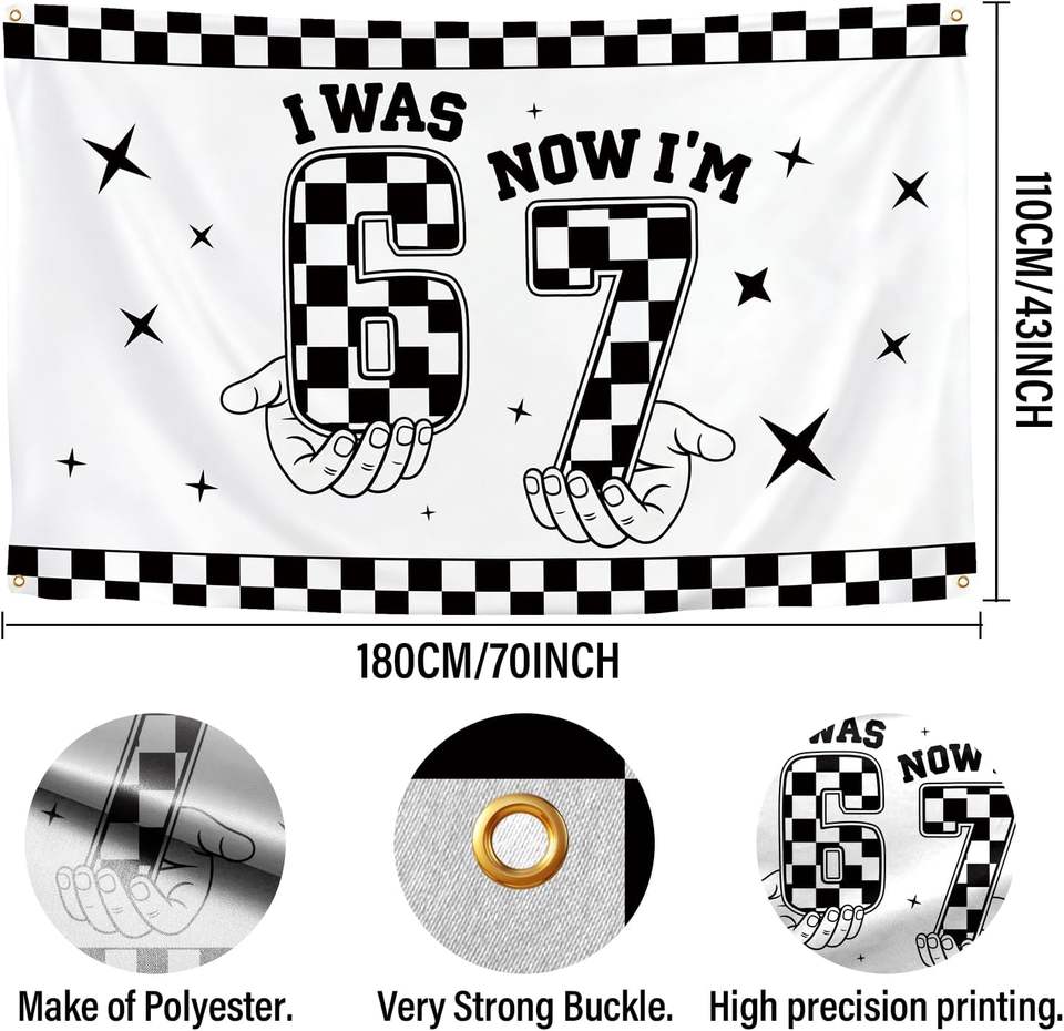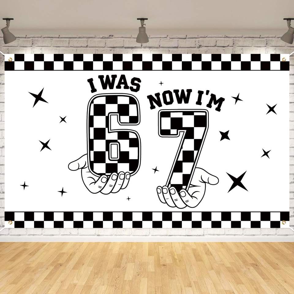 Je suis allé de 6 à 7 ans, maintenant je suis de 7 ans, bannière de fond pour anniversaire, blanc et noir à carreaux, 6 7, décorations amusantes pour fête d'anniversaire de 7 ans, fournitures